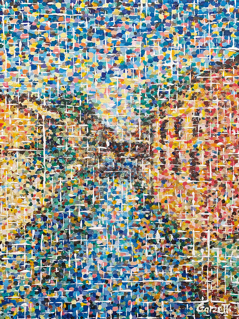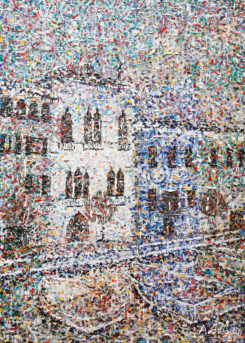 “L’artista Alessandra Garzetti, per le sue opere, utilizza una tecnica nuova ed originale: l’insieme delle pennellate colorate danno forma al dipinto che viene poi ultimato con la realizzazione di un effetto simile a quello di un tessuto bianco, i cui fili vanno ad uniformarsi al disegno di fondo, creando un interessante gioco prospettico.