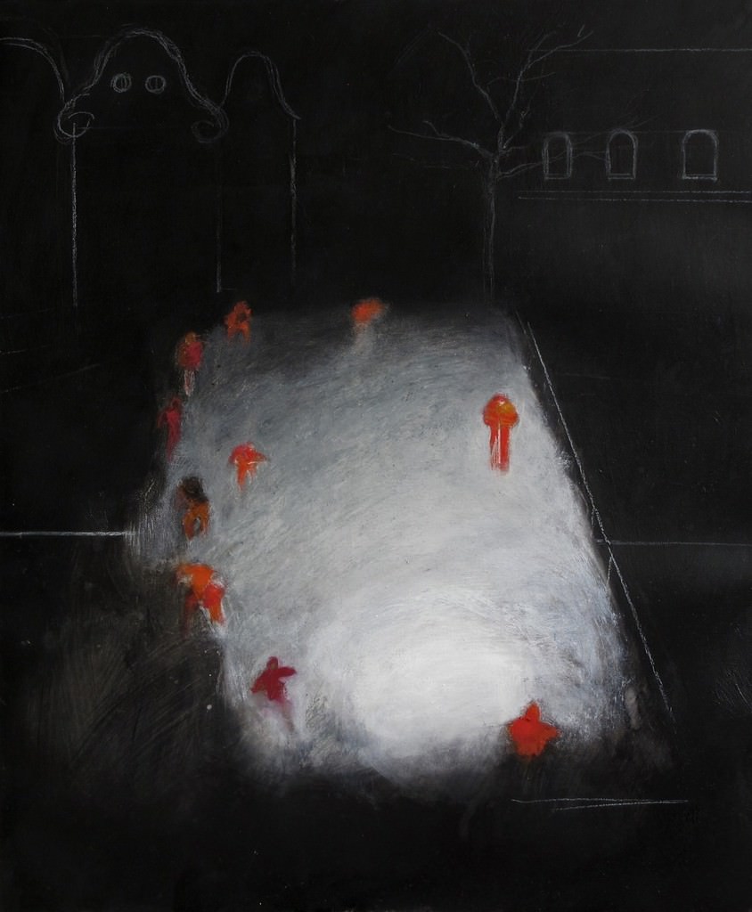 E’ ribadita, in questi lavori inediti, la consuetudine di Alessandra Giacinti sia con la narrazione cinematografica e le sue messe in scena, sia con la strip disegnata: ogni singolo evento – colto quasi come in un fotogramma – racchiude uno svolgimento potenziale, accennato anche dallo sconfinare di un soggetto oltre il singolo medium.