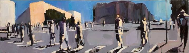La pittura della Giovannoni prende spunto dal paesaggio metropolitano di Roma e ne trasfigura i luoghi in deserti di luce, dove il traffico e caos cittadino sono ridotti al silenzio. Luoghi realmente esistenti si dilatano e mutano i loro confini. Spazi della metropoli romana che perdono identità per diventare territori dell’assoluto di forte suggestione poetica.