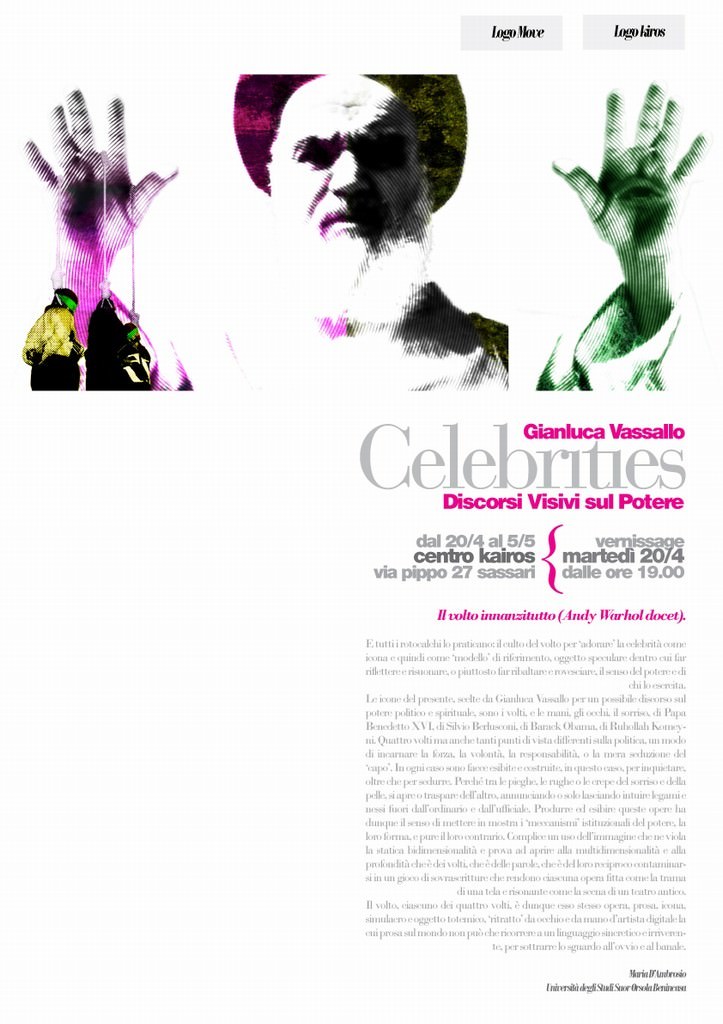In occasione di tale iniziativa ci sarà inoltre la chiusura della mostra “Celebrities” di Gian Luca Vassallo che indaga il rapporto tra potere e democrazia, tra necessità (del Potere) di stabilire un ordine morale e bisogno degli individui di rappresentarsi attraverso un'etica personale. In ultima, il progetto si addentra nell'analisi della contrapposizione, a volte vana, tra violenza dell'azione collettiva e soggettività critica.
