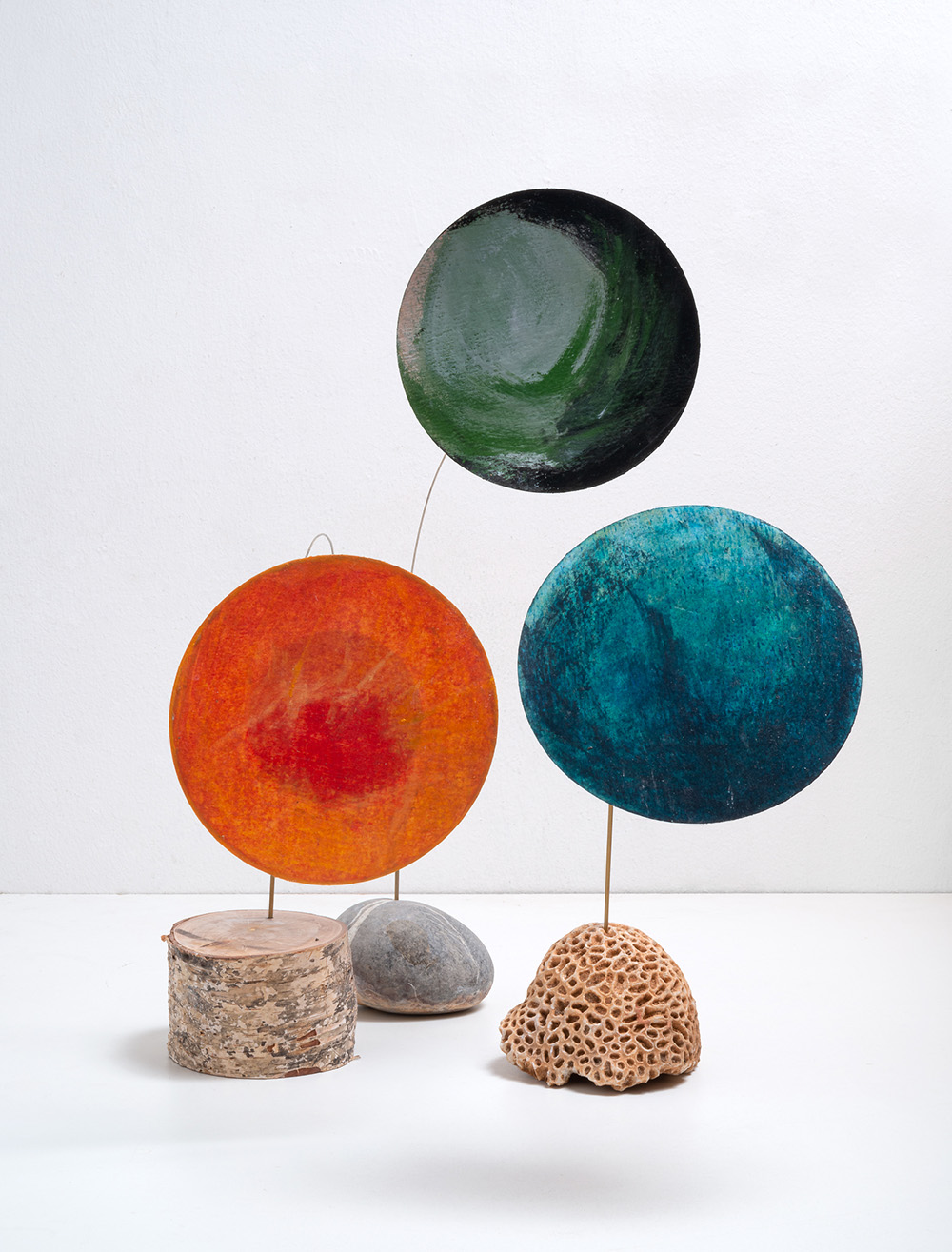 La mostra si compone di una numerosa serie di piccoli dipinti tutti dello stesso formato e di uno solo, più grande. Un corpo di opere inedite dove la ricerca dell’autrice offre alla vista uno spazio disseminato di tondi dipinti e di sculture leggere.