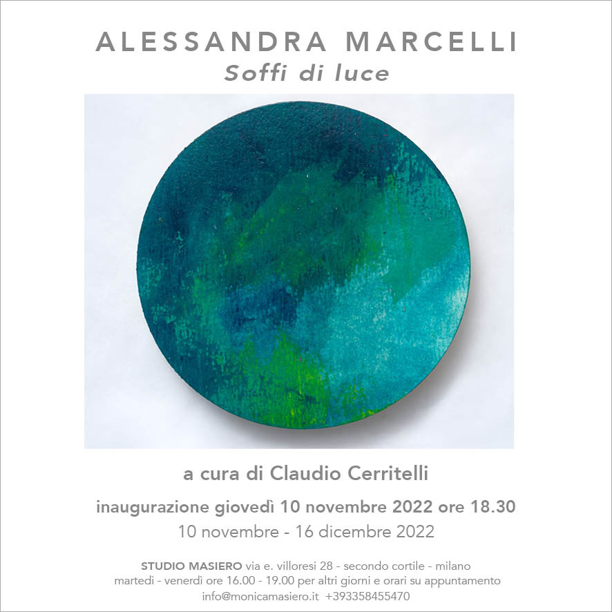 La galleria Studio Masiero è lieta di ospitare la personale Soffi di luce di Alessandra Marcelli, a cura di Claudio Cerritelli. La mostra si compone di una numerosa serie di piccoli dipinti tutti dello stesso formato e di uno solo, più grande. Un corpo di opere inedite dove la ricerca dell’autrice, si concentra sulle possibilità cromatiche dell’olio e dei pastelli sulla carta e sulle diverse possibilità di allestimento offrendo alla vista uno spazio disseminato di tondi dipinti e di sculture leggere. “Dischi pitto-plastici” come li ha definiti Claudio Cerritelli, nel testo alla mostra, opere sospese a sottili fili metallici mantenute da basamenti di origine naturale, a ribadire il legame con la terra, oppure appesi a parete e mantenuti a piombo da originali trouvaille che completano l’equilibrio delle forme.