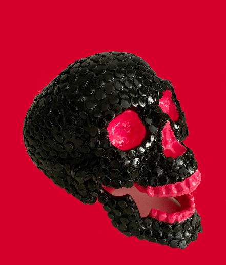 Nella prima sala l’opera con cui si apre la mostra “Malinconiche presenze” è una sagoma, appena accennata, di un corpo in movimento. Tutto parte dalla materia grezza della sagoma, che sembra quasi un essere sfuggente e spirituale “un’anima”. Questo percorso immaginario prosegue con un lavoro il cui linguaggio è declinato dalla cultura “POP”: i tre teschi. Realizzati con colori fluo e ricoperti di puntine, vogliono rappresentare la parte finale del ciclo della vita, ovvero ciò che resta del corpo dopo la morte, il teschio. I tre teschi sono l’ultimo lavoro dell’artista in cui la trasformazione dalla dimensione della materia grezza a quella apparentemente più ludica, colorata e spensierata della dimensione ”POP”, viene espressa dall’uso delle puntine.