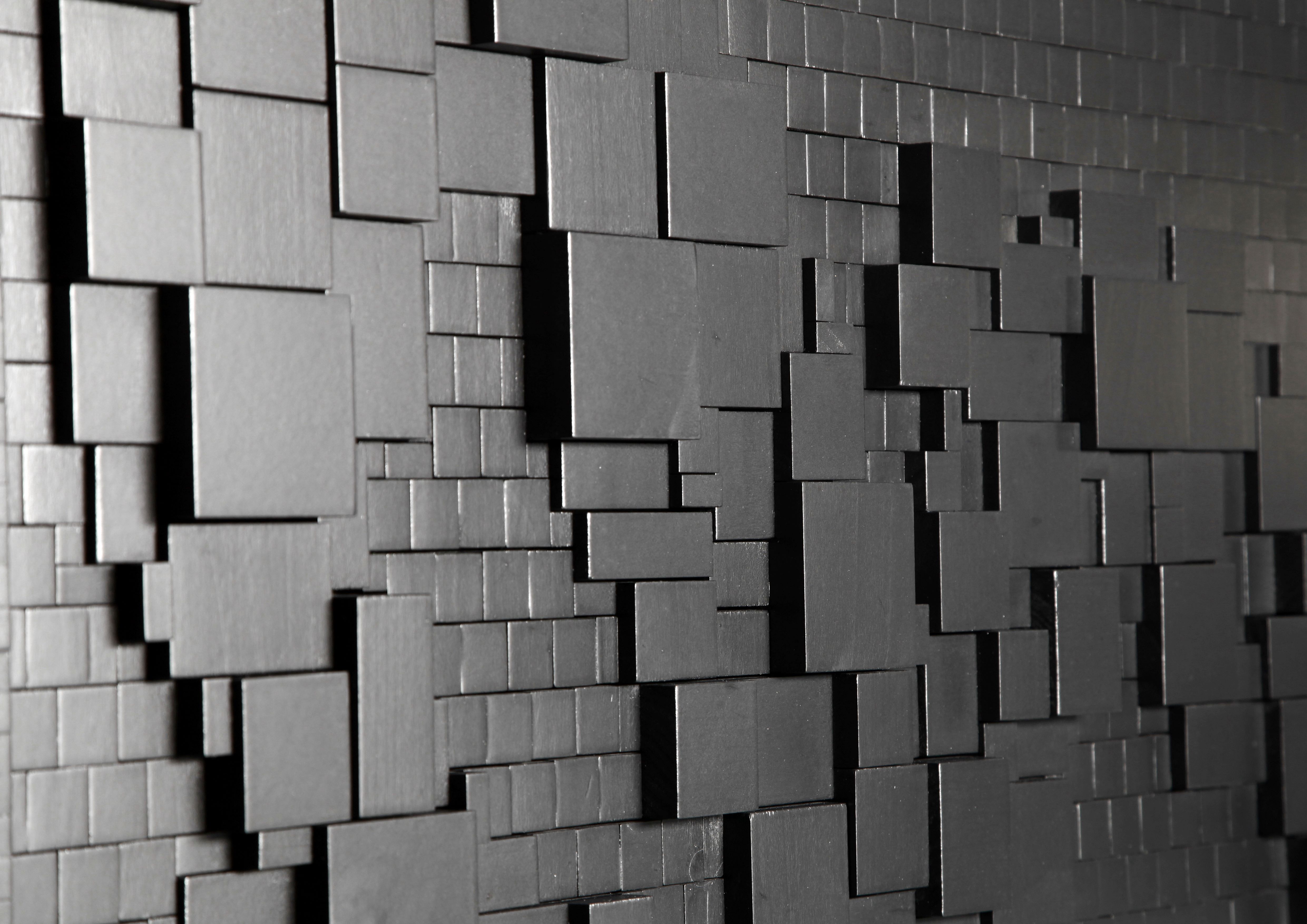 Mosaico da parete in bassorilievo. Rota predilige il legno di toulipier (famiglia delle Magnoliaceae) che lavora e riduce in formato tessera dando vita ad una costruzione simile a scacchiere mobili formate da più strati sovrapposti.