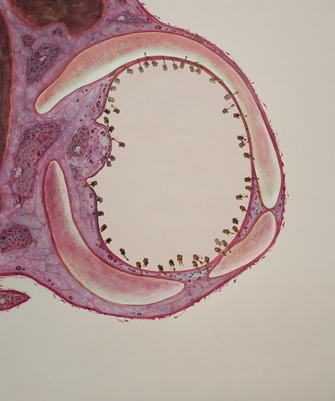 Attraverso una serie di opere pittoriche realizzate ad olio e collage fotografico, raffiguranti sezioni istologiche sulle quali operano macchinari microscopici, l’artista eleva al campo del visibile anche ad occhio nudo l’affascinante microcosmo dei tessuti organici.