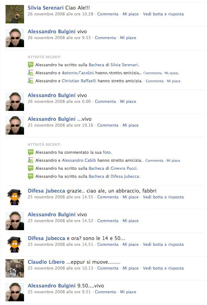 Alessandro sacrifica dunque il media facebook fin dalla sua iscrizione all’operazione finale. Decide solo in parte di parlarci del tempo che passa ed è passato, della memoria di se, da tutti e con tutti oramai raccolta in condivisione on line e non più negli scatoloni delle foto dei magazzini di casa, ma soprattutto decide ancora una volta di farne mistica, nuova mistica. Un punto di vista importante e attuale di un artista che dentro alla condivisione in rete dei segreti e dei pareri di tutti si è “limitato” (ma quanto ci sarebbe da dire invece) a definirsi soltanto “vivo”.