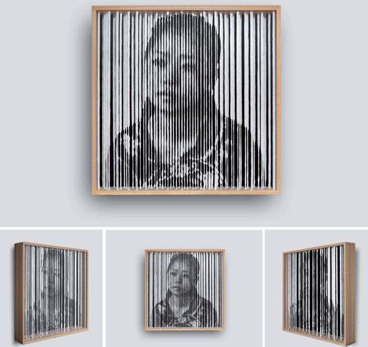Che siano sottili strisce di tela attentamente sagomate o aste di legno intagliate, è ciò che sta tra di essi il protagonista, il soggetto del suo lavoro, ovvero il vuoto. Un vuoto che diviene essenza rivelando un’operazione che va ben al di là di qualsiasi evoluzione del concetto di arte optical poiché del soggetto ritratto, che sia un volto femminile o un paesaggio incantato, è la sua anima a scaturirne e a prendere vita. In questo senso è coerente l’interesse che l’artista ha per la fotografia che, per distaccarsi dal mero scatto e divenire forma d’arte, necessita della ricerca di uno spirito e della coscienza interiore in ciò che si vuole ritrarre e raccontare.