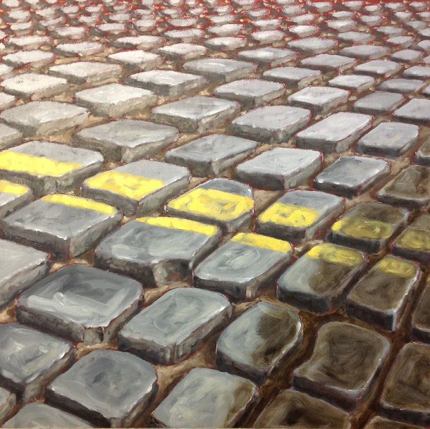 Questa mostra vuole esplorare due episodi dell'attività di un giovane artista, Alessandro Costa: l'Oggetto e il Sanpietrino. Una sezione viene riservata alle prime opere di più forte impatto realistico: "Dopo un oblio di anni, Alessandro Costa ritornò alla pittura, si incamminò verso il monte Parnaso a redere omaggio ad Apollo e le sue muse. Lungo il cammino, si fermava a dipingere, non dipingeva l'aria, le foglie, il paesaggio, dipingeva la strada" (Vincenzo Mazzarella). "I sampietrini raffigurati in modo realistico con tecnica mista hanno subito nel tempo una consapevole sintesi, acquisendo leggerezza e trasformandosi in un simbolo che è al tempo stesso evoluzione verso una forma nuova e reliquia, nel senso etimologico, del blocco lapideo: un rettangolo bidimensionale con all’interno una linea segmentata che ne ricorda la tridimensionalità ormai superata" (Rocco Marino). E un'altra nel suo sviluppo in senso più strutturale, dove l'oggetto diviene opera grafica: "Il blocchetto di leucitite laziale di Papa Sisto V e di monsignor Ludovico Segardi, prefetto ed economo della Fabbrica di San Pietro, diventa un oggetto siderale che non ha più una funzione e ha perso la memoria del calpestio, il peso, l’andatura, la lentezza o la velocità del passo. E’ ora una forma aerea, una superficie futuribile e impossibile" (Roberta Giulieni).