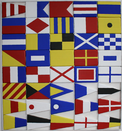 In questa esposizione Alessandro D’Ambrosio ha voluto riproporre attraverso lo strumento dell’arte contemporanea, un’attenzione verso la simbologia delle bandiere nautiche. Oggi la tecnologia con i suoi complicati strumenti elettronici ha offuscato i vecchi metodi di comunicazione a favore di un linguaggio freddo che ha soppiantato i colorati codici visivi. La grafica delle bandiere che ci propone Alessandro D’Ambrosio esalta i veri simboli di comunicazione navale; le tele, anche sovrapposte, sono eseguite con una tecnica che rafforza il messaggio che rappresenta. Ottenendo un effetto ottico di profondità e un movimento, l’artista rievoca lo sventolare delle bandiere al vento, esprimendosi autenticamente verso un recupero della tradizione marinara.