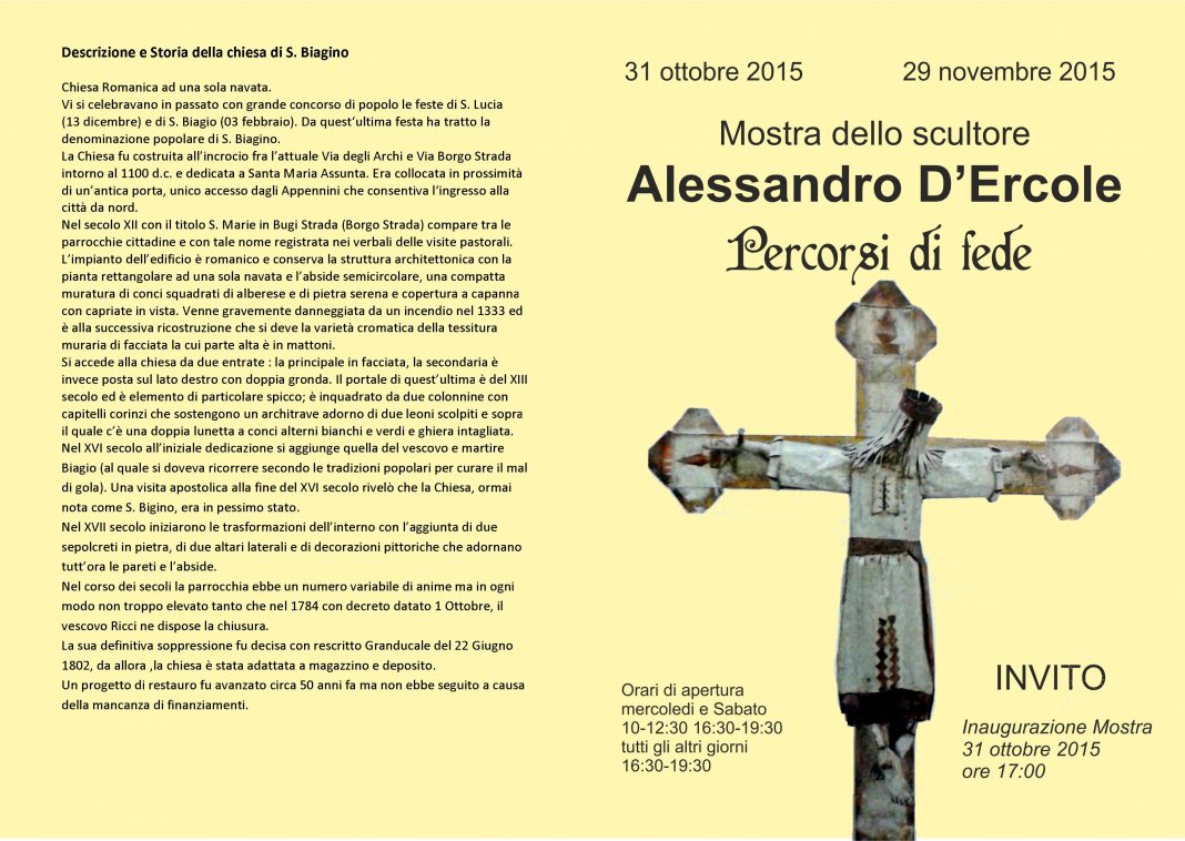 Percorsi di Fede è la personale di scultura che l’artista Alessandro D’Ercole presenta negli spazi della chiesa di S.Biagino di Pistoia
