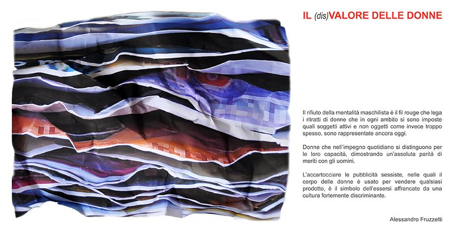 Con “Il (dis)valore delle donne” Fruzzetti racconta e denuncia, proprio per questo suo impegno civile, la violenza contro le donne. Ed apre gli occhi su un’altra violenza strisciante, fin troppo tollerata, che non è fisica, ma quella trasmessa da messaggi pubblicitari in cui serpeggia, con un becero frasario, un’idea maschilista che denota ancora arretratezza culturale. Le battute a doppio senso che ricordano la caserma o certi filmetti sexy all’italiana sono una violenza diversa che tuttavia mortifica e inorridisce. Fruzzetti ha raccolto questi manifesti pubblicitari e ha fotografato dodici donne, affermate nel loro lavoro, che appallottolano e lacerano questi messaggi. Ne ottiene dodici immagini in cui è espresso il rifiuto in modo singolare: sulla stessa tavola è posto, incollato, il manifesto stropicciato (e quindi negato) e la donna che si ribella al messaggio, appunto strappandolo, perché non si sente sottomessa o assoggettata, come invece quel messaggio vorrebbe suggerire.
