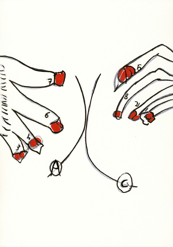 Andrea Guerzoni tutti i lunedì pomeriggio da due anni fa la sua scelta. Quella di andare a trovare Carol Rama. Il primo incontro tra Andrea e Carol avviene circa dieci anni fa ed è raccontato in forma di favola ne La strana storia della rana di Carol Rama che ha segnato l’inizio della produzione dei “librini” di Guerzoni, pubblicazioni che raccolgono aforismi, poesie e disegni. “Con Carol”, dice Andrea, “ho una comunicazione preferenziale fatta di parole, segni, gesti, attenzioni, rassicurazioni, tenerezze, parolacce, battute di spirito, invenzioni, gelati al cioccolato, ma anche di sguardi e di silenzi complici.” Inchiostri su carta della serie Omaggi a Carol Rama, dal segno felice e il tratto veloce, raccontano gli incontri, le battute e gli aforismi del lunedì: tra una Carol Rama a braccia aperte sulla cima della Mole Antonelliana, simbolo della loro Torino, e la traccia di due natiche siglate una con la lettera A e l' altra con la lettera C, a testimoniare un'unione divertita.