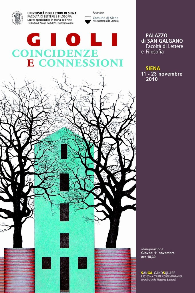 L’esposizione dei disegni Coincidenze e Connessioni di Alessandro Gioli è il terzo appuntamento del nuovo ciclo della rassegna SANGALGANOSQUARE, curata dal Prof. Massimo Bignardi e organizzata dalla Cattedra di Storia dell'Arte Contemporanea del corso di Laurea Specialistica in Storia dell'Arte, manifestazione sostenuta dal preside della Facoltà di Lettere e Filosofia, il Prof. Roberto Venuti e patrocinata dal Comune di Siena nell'ambito del programma promosso dall'Assessore alla Cultura, Prof. Marcello Flores d'Arcais.