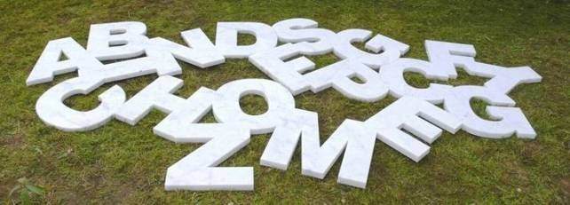 Il messaggio trasmesso è sempre complesso e richiede un piccolo sforzo intellettuale da parte dell’osservatore che, studiando attentamente l’opera, ne deve ricostruire l’origine e quindi lo scopo. Lettere di marmo, incise, dipinte e traforate, installate nel giardino del chiostro. Le parole sono frazionate, distinte, come le più piccole unità distintive di un sistema grafico. La comunicazione è globale e univoca, immediata e remota. Il linguaggio da bidimensionale diventa tridimensionale, la parola diventa messaggio linguistico ed artistico. La cadenza tra pieni e vuoti, colore e candore, detta un ritmo a sé stante, sonoro e visuale, calcolato e perfetto, assolutamente non casuale.