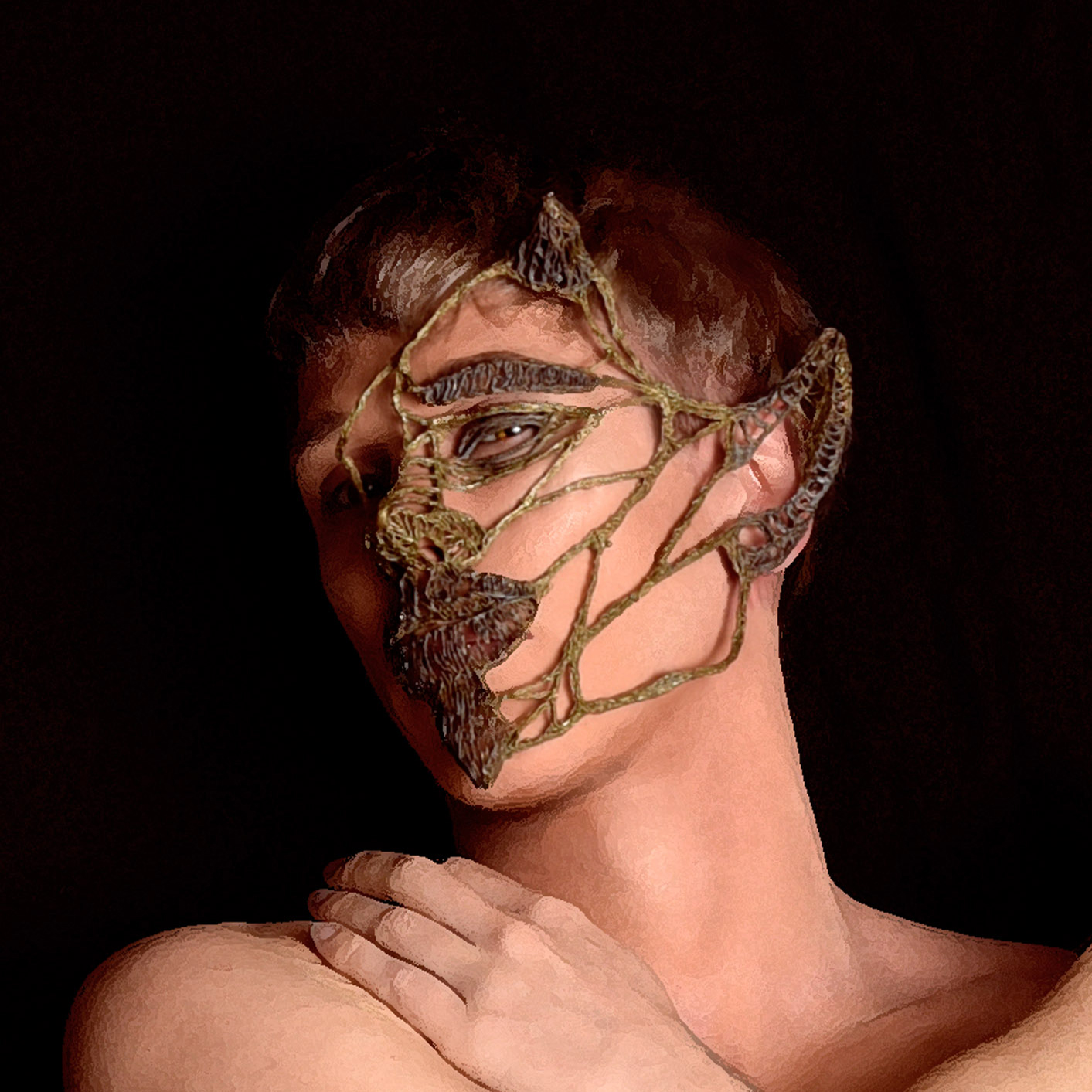 Infine altre maschere creano identità nuove, alcune delle quali a immagine e somiglianza dell’artista, altre aliene e futuristiche, caratterizzate da diverse tipologie di texture, intrecci e modularità. Queste strutture sono modellate sempre a mano creando micro-reticoli che di volta in volta assumono aspetti e sequenze diverse: alcune a trame più ramificate e irregolari, altre secondo sviluppi ordinati e di forma sferica”.
