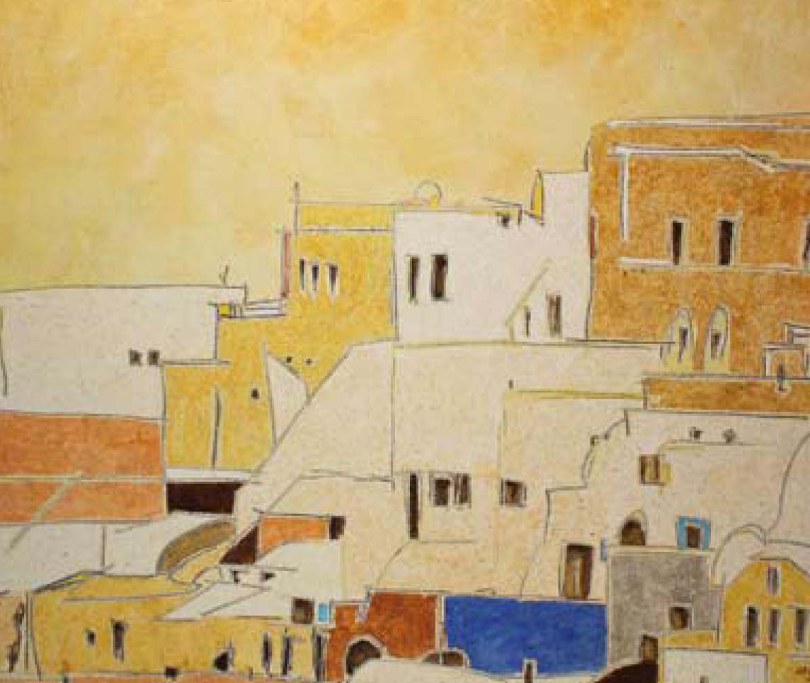 I soggetti sono paesaggi dominati da costruzioni, case e muri addossati ed essenzializzati fino a ricordare certi paesaggi mediterranei delle Cicladi, fatti di case senza tetto, semplice muro giustapposto ad altri muri, e già in questo cortocircuito fra soggetto architettonico e “pittura per l’architettura”, quale di fatto è l’affresco, pare di grande modernità e interesse. Come di grande interesse e modernità è il passaggio (in comune con il mosaico) dalla destinazione parietale originaria alla “portabilità” di un supporto contenuto, uno slittamento interessante che consente effetti di significativo straniamento.