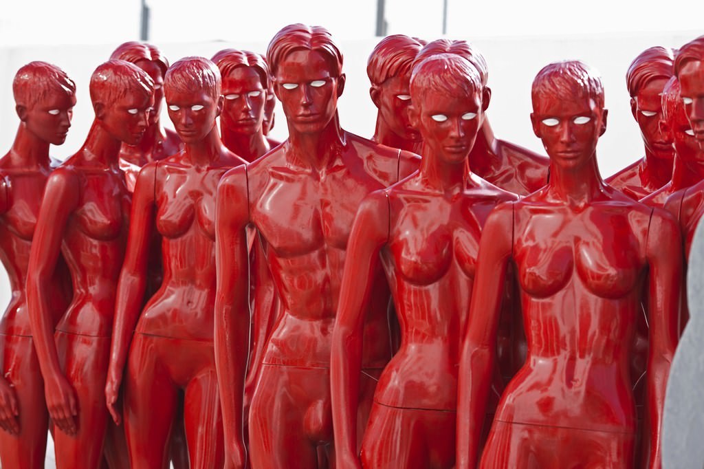 L’umanità che i suoi manichini plastici offrono è il campione di un processo di omologazione al quale essa sembra inevitabilmente sottoposta. Gli androidi sono tutti dello stesso colore, nudi (il nudo è spersonalizzante, paradossalmente quanto lo sono le uniformi, nelle quali almeno ci sono i gradi a mantenere un certo orientamento distintivo), privi di pupille con i soli bulbi oculari bianchi che rendono l’uno simile all’altro. L’artista ha dato titoli alle sue opere: Turba (nel doppio senso di voce del verbo turbare: terza persona dell’indicativo presente, ma anche seconda persona dell’imperativo; senza dimenticare il significato di massa, che è una terza opzione di verità); Gabbia (quella che l’umanità, giorno dopo giorno, si costruisce attorno e dentro la quale finirà inesorabilmente imprigionata); Umanità (tre manichini di differente colore – è l’unica eccezione alla monocromia – vale e dire l’umanità dei bianchi, dei neri e dei gialli, legata alla stessa catena, allo stesso destino: ma se ne accorgerà?”