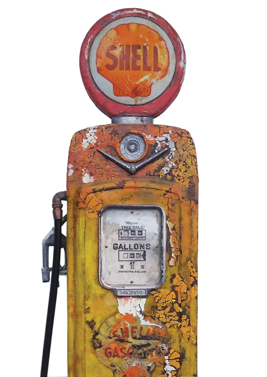 Foto allelata:Entropia uno a uno (1:1) - Tecnica mista su tela - resine - tubo originale di un vecchio distributore di benzina - impianto di illuminazione della corona superiore (220 volt) - dimensioni: 215x120x15 cm.