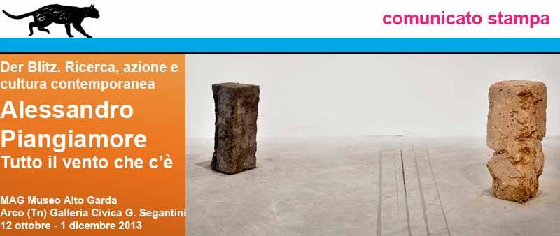 Rappresentare un elemento inafferrabile come il vento: questo è l'obiettivo dell'artista siciliano Alessandro Piangiamore che, per il secondo progetto 2013 di Der Blitz del MAG Museo Alto Garda, propone un lavoro che è oggetto di una sua residenza estiva nella zona dell'Alto Garda e che, da 12 ottobre al primo dicembre sfocia nella mostra Tutto il vento che cè allestita alla Galleria Civica G. Segantini di Arco.