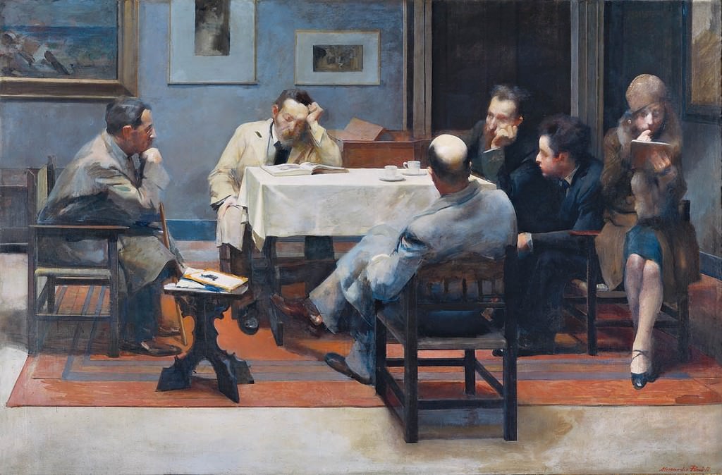 Chiuse in salotti, interni e in atelier reali o simulati – come quello dello scultore di Contemplazione, degli anni Trenta -, isolate (come la Contadinella) contro cieli limpidissimi e fondali marini abbaglianti di luce, le figure del veneziano Alessandro Pomi paiono indifferenti e sospese in un’atmosfera silente. I richiami tra i quadri si fanno sottili, in un gioco di personaggi, pose e corrispondenze che ricorre pure nei titoli in chiave musicale, dal Concerto dei chierichetti (con una dedica di Meneghini) al più tardo Intermezzo (o Intimità; altrove si ricordano Accordi e Melodie). Ricorrente negli interni è la presenza di uno strumento silenzioso, ossia la spinetta che sta dietro al doppio e raggelato terzetto contemplativo di Cenacolo (1931), con gli uomini assorti nell’attesa e la donna nella lettura, che ebbe successo a una delle mostre internazionali di Pittsburgh, dove Pomi esporrà almeno dal 1926 al 1935 (vi partecipava in quegli anni anche Edward Hopper).