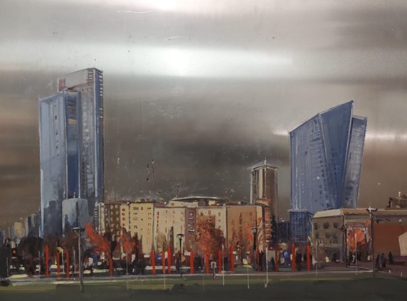 Una città in continua crescita e trasformazione che l’artista ha saputo per primo raccontare attraverso i suoi dipinti con una connotazione contemporanea senza lasciare indietro [Marco Meneguzzo]. Ma non è facile dipingere una città contemporanea senza cadere nel semplicistico, e Russo riesce a trasportare l’eredità dei suoi predecessori paesaggisti attraverso un processo di colori e toni vibranti che vanno a definire vedute urbane, grattacieli e architetture disegnate da accurate pennellate contornate da elementi realistici e che si stagliano verso un cielo quasi non dipinto. Quella tradizione futuristica di Umberto Boccioni (anch’egli nato in Calabria e vissuto a Milano per anni) e della sua “Città che sale”, che già dai primi del Novecento testimonia una forte e dinamica crescita urbana del capoluogo lombardo, tradizione ripresa e portata avanti nelle opere di Russo.