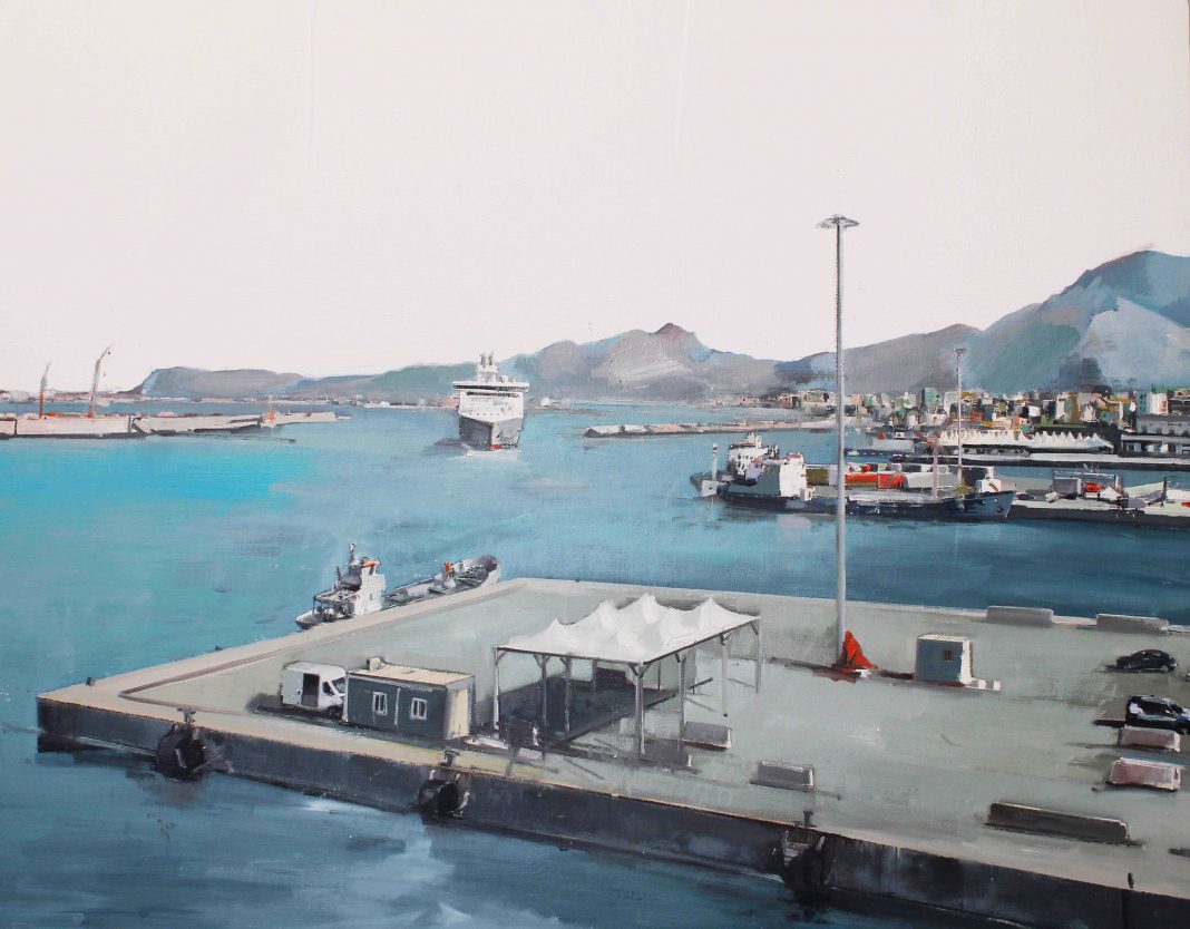 La mostra, curata da Marco Meneguzzo, consiste in un’ottantina di opere, quasi tutte recenti o recentissime, ma con qualche incursione nei primi anni della maturità espressiva dell’artista. Si tratta quindi di una vera e propria antologica, dopo la mostra che il Complesso Monumentale di San Giovanni gli ha dedicato nel 2011, che comprende quasi tutti i cicli pittorici che hanno caratterizzato la sua attività. I “comizi”, i “paesaggi industriali”, gli esempi di “recovery art”, i “paesaggi urbani” e infine i “porti” sono rappresentati compiutamente nella loro nascita e nel loro sviluppo (l’artista a volte procede contemporaneamente su più cicli), e l’insieme degli stessi contribuisce a rivelare un artista che oggi è nel pieno della sua maturità espressiva.