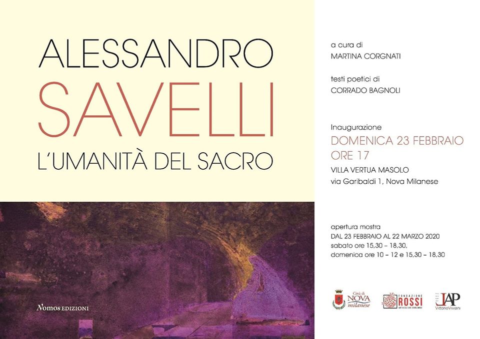 Dal 23 febbraio al 22 marzo 2020 Villa Vertua Masolo ospiterà “Alessandro Savelli. L’umanità del sacro”, personale di Alessandro Savelli curata da Martina Corgnati. La mostra sarà dedicata alle opere realizzate dall’artista tra il 1985 e il 2019, che affrontano il tema del sacro.
