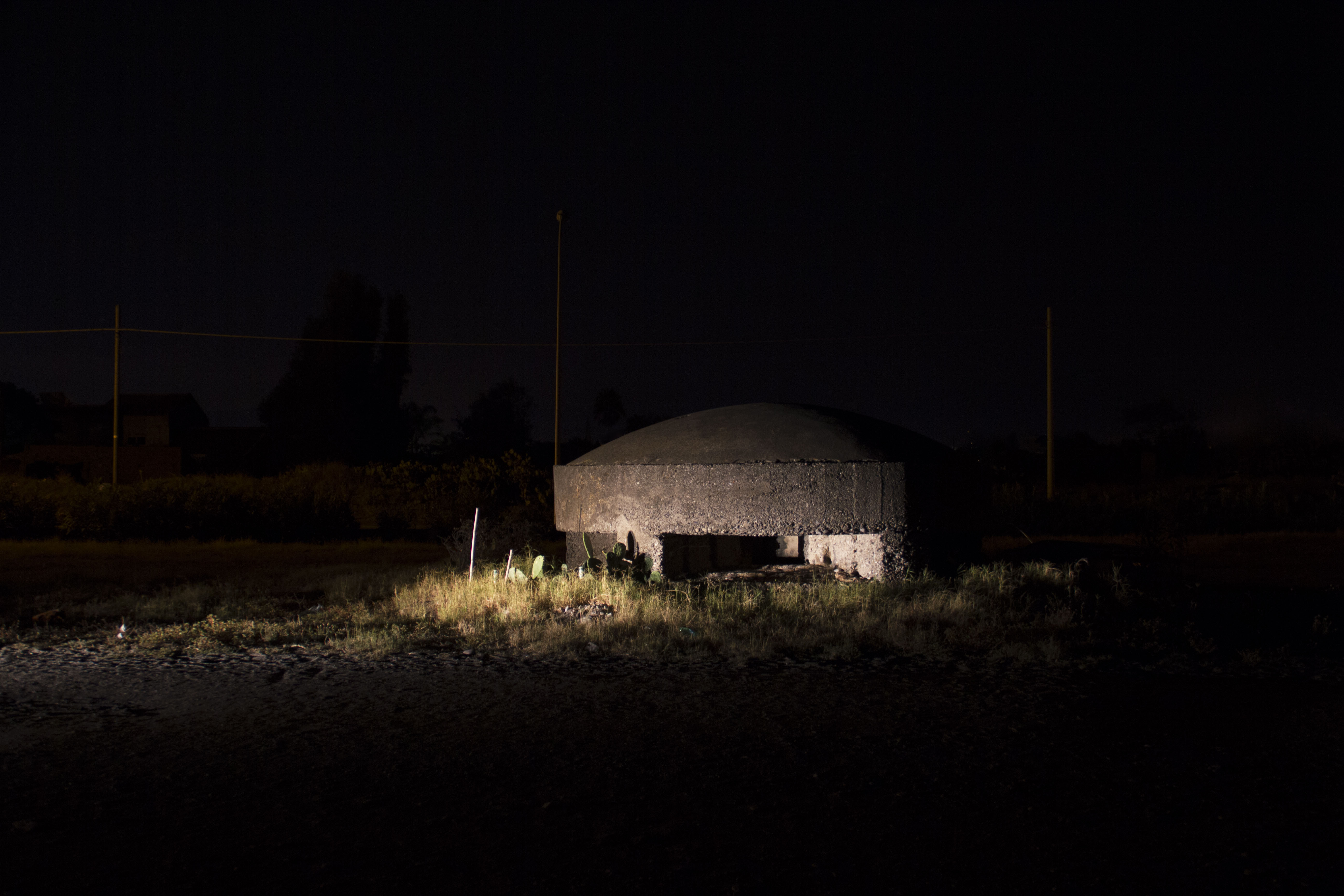 In – La casa empatica – Arianna Baldoni analizzando opere e percorso stilistico dell’artista sottolinea che [….] l’opera di Barchitta non ha valore stilistico o edilizio, ma è rivolto all’abitare come idea originaria, fondativa, una sorta di riscoperta radicale del nomadismo, della casa in qualità di contenitore eterogeneo e transiente, fatto di pareti che respirano le vicende e la memoria di chi le ha vissute. Il progetto intitolato Errante eterotopico, composto da una versione abitativa in telo isotermico sorretta da murali in abete e poi da una scultura in legno di scarto che replica una casa sottodimensionata (cui si aggiunge un multiplo mobile in miniatura), richiama l’idea archetipica della capanna primordiale, ne racchiude gli stessi principi nella sua essenza formale e animistica, esprimendo quella rara capacità di cogliere le tracce più profonde che si celano nell’inconscio collettivo. [….] nel lavoro inedito site-specific dal titolo Kick me( presentato nella galleria di ricerca milanese Amy d Arte Spazio dal 10 oct. all’01 nov. 2019) ,emergono gli aspetti salienti della sua poetica con declinazioni ludiche. Si tratta di un ambiente di grandi dimensioni (2x6 metri) composto da un tessuto nautico sul quale sono impresse le immagini di cinque bunker risalenti al Secondo conflitto mondiale, fotografati di notte. All’interno dell’installazione si estende un prato sintetico che ospita alcuni palloni da calcio creati con piastrelle e materiale edilizio trovati nel letto di un torrente nel messinese, divenuto oggi una discarica abusiva. Le sfere multicolori producono lo stimolo di essere calciate, un impulso che rimane però compresso sotto forma di puro desiderio, mentre l’impianto che le custodisce appare in antitesi tra la leggerezza del fabbricato e la costellazione fotografica delle fortificazioni militari. Nuovamente ritorna il conflitto, la dicotomia che Barchitta sembra risolvere nella mutazione, nel passaggio fluido di concetti ambivalenti, ma insiti nella stessa radice animistica, che detiene in sé il principio del movimento empatico tra realtà esterna e mondo interiore [….]