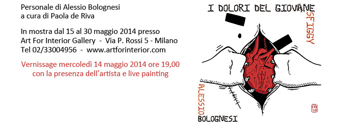 Guardando le sue opere di poco meno di due anni fa ci si accorge di come Bolognesi sia passato da campiture di colore pieno ed effetti volutamente 2D, che poco tengono conto della luce e delle ombre, dove il tratto è preciso e rigorosamente trattenuto, privo di sbavature, a opere su tele di lino grezzo macchiate da colature ed il protagonista, Sfiggy, che acquisisce un’espressività non più rigida (quasi compiacente) di registro propriamente fumettistico: i segni, le ferite, i dolori lo hanno pervaso di un’aura icastica.