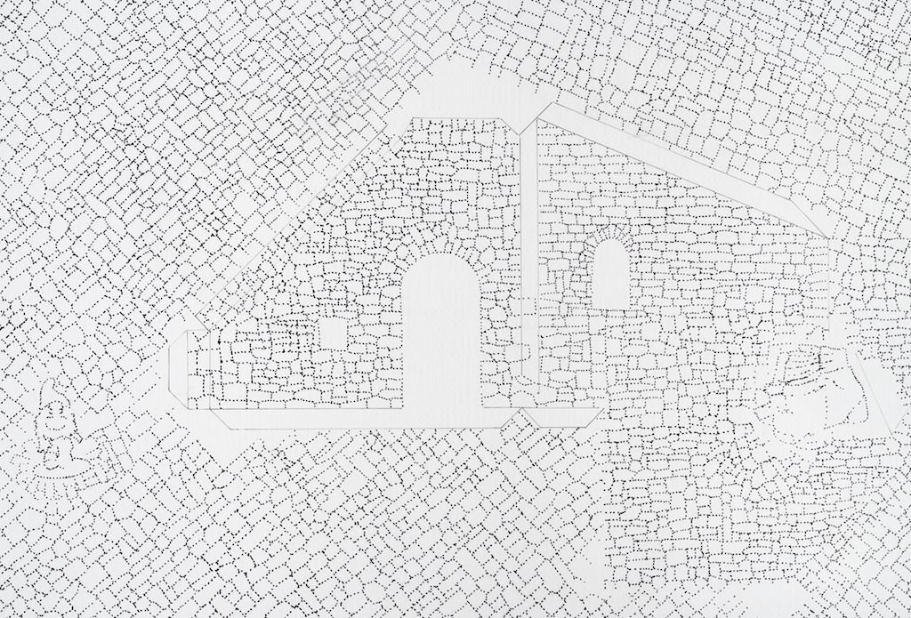 A parete, il disegno a punti Cartamodello di piccola casa vuol essere una sorta di labirinto volutamente privo di pathos, come l’autore stesso dichiara, dove è riconoscibile la pianta di Oblom, razionale rappresentazione di uno spazio senza aggiunte decorative per renderlo più seducente. Seguono Découpage e Simulation painting che simulano la pittura smontando per poi rimontare ciò di cui è fatta. Tutta la ricerca di Larocchi è concentrata su questo: luce, colori, linee, forme, segni, quindi monocromi, quindi significanti muti, quindi tecnologie, e sulla simulazione di tutto ciò attraverso le varie tecniche e medium e il loro stesso svuotamento. Vi appartengono anche le due opere Rigato e Scheda per test visivo. Tutte prove di pittura su una superficie in libere giustapposizioni di tonalità o di esatta ripetizione di segni. Anche la scelta di introdurre sbianchettature e cancellazioni sono ricerca di anomia nell’uso e accostamento dei colori, che fa emergere uno spazio concettuale che diventa la superficie di ciò che non ha immagine.