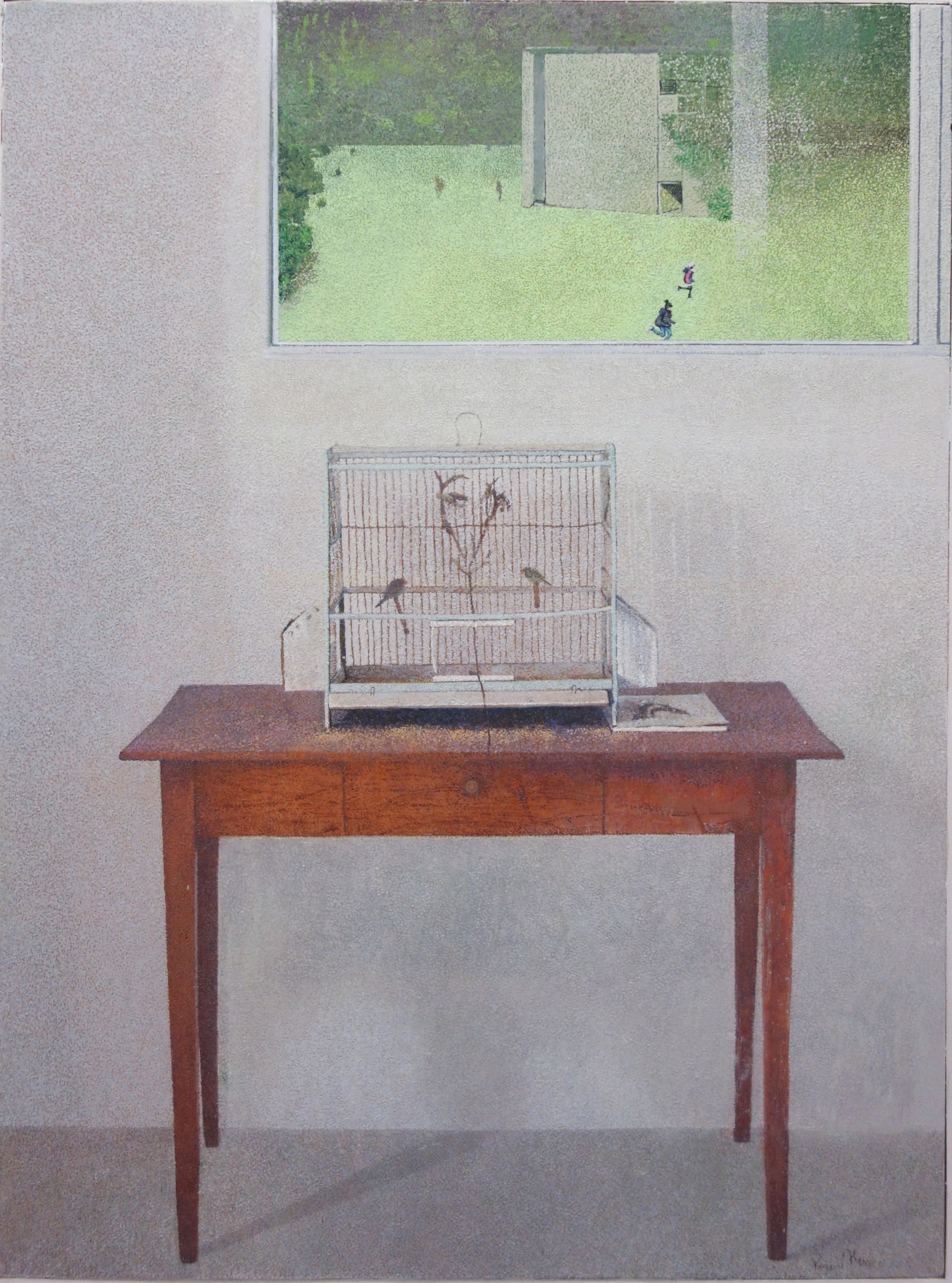 Alessio Vaccari nasce a Pisa nel 1977. Si avvicina alla pittura a circa vent’anni; dopo il diploma di perito tecnico e due anni di Facoltà di Scienza Naturali di Pisa, decide di seguire la sua vocazione e iscriversi all’Accademia di Belle Arti di Firenze. Successivamente si trasferisce a Roma per completare i suoi studi specializzandosi in decorazione e conseguendo l’abilitazione all’insegnamento in Storia dell’Arte e Arte e Immagine. Negli anni ha maturato la sua ricerca artistica attraverso lo studio caparbio e appassionato della grande tradizione figurativa in una linea ideale che comprende la pittura naturalistica romana, Vermeer, Chardin, Friedrich, Seurat, Hammershöi, Giacometti, Ferroni, Guccione. Personalità inarrivabili, tutti parte di una famiglia spirituale, uniti dall’esigenza di elaborare, attraverso gli strumenti del mestiere, la sensazione di indefinito che appartiene allo spazio, alle cose stesse, alla memoria che le custodisce. La sua prima fonte di ispirazione è sempre lo spazio e la luce che lo struttura; tuttavia è difficile dire esattamente cosa l’artista voglia esprimere, è più un certo sentire… la vibrazione della luce, il sospiro del tempo immobile, l’indefinita percezione dell’essere. “Ricordo da bambino che mi inquietava la percezione di spazio nella stanza dei giochi in rapporto a piccoli giocattoli che sempre prediligevo a volte provavo la sensazione di infinito simile al ricorrente sogno della caduta nel vuoto.” La sua ricerca si fonda quindi su trame di piccoli punti di colore ad olio sovrapposte in lente stesure che vanno via via a comporre un’immagine evanescente. Un riflesso mentale dell’immagine che inizialmente ha davanti agli occhi, nel suo studio/giardino. L’altro aspetto che sente importante nel suo lavoro è il tema dell’ironia e della leggerezza che si manifesta nella ricerca di particolari soggetti e rapporti cromatici come a mantenere un equilibrio con l’aspetto esistenziale più drammatico. Così nelle sue composizioni (termine molto amato dall’artista in quanto frutto della ricerca di equilibri spaziali geometrici e delicati pesi visivi di cromie) si affacciano temi simbolici come la gabbia rotta da un piccolo uccelletto, iPhone distrutti, piccoli burattini, microcosmi arborei fatti di trame di segni che Vaccari restituisce in modo personale con lenta ripetizione di un singolo punto, oltre l’osservazione immediata, si va a comporre l’ordito mentale dell’opera. Attualmente vive e lavora a Rosignano Solvay, Livorno.