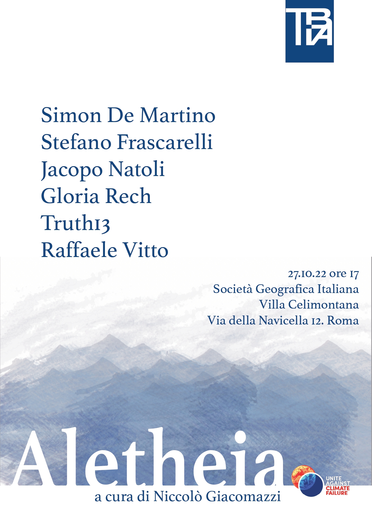 La TIBA COMMUNITY partecipa alla Roma Art Week con la mostra collettiva ALETHEIA a cura di Niccolò Giacomazzi e con la presenza degli artisti Simon De Martino, Stefano Frascarelli, Jacopo Natoli, Gloria Rech, Truth13 e Raffaele Vitto, ospiti della Società Geografica Italiana.