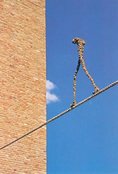 In mostra sculture in corda, funamboli ed equilibristi in bilico sul filo della vita, bronzi che si sostengo a vicenda in una perfetta e temporanea fusione, resine e ceramiche.
