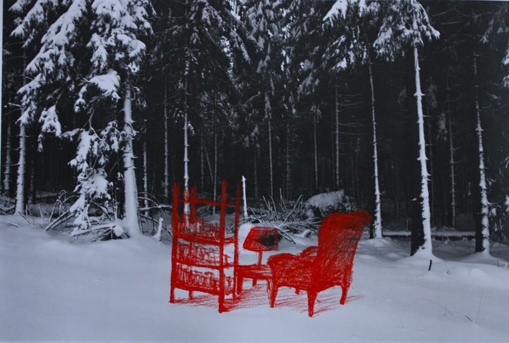 Nel secondo gruppo di opere, invece, il tratto rapido oscillante tra l’osservazione da vicino e quella da lontano, cioè tra appartenenza e distanza, si sovrappone ironicamente – ma privo della violenza del collage – alle fotografie di scenari urbani e di paesaggi che spaziano dalle rassicuranti vedute romane, ai boschi innevati, fino ai sentieri e alle radure sospese tra gli alberi. Le incongrue presenze domestiche evocano giochi surrealisti e fanno pensare a scenografie abbandonate da una bizzarra compagnia di giro, fino alla prossima interpretazione.
