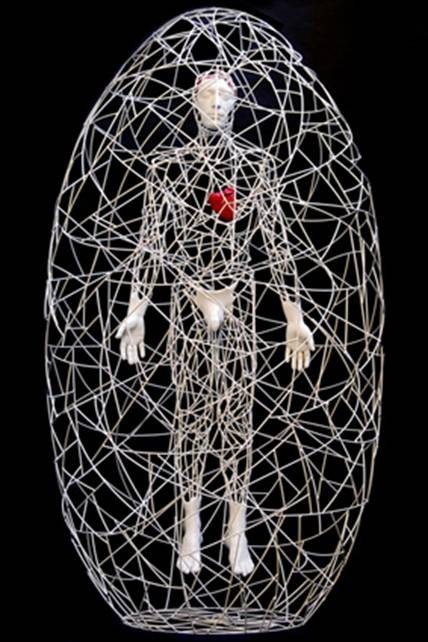 L’opera che apre la strada alla mostra, è un uomo che esibisce il cuore senza paura e senza vergogna. Il cuore è tutto ciò che ha, ma che sembra preoccuparlo. Il suo cuore è ciò che ha di più prezioso e non intende nasconderlo. Quello che occupa i suoi pensieri è l’instabile equilibrio tra sensi e spirito, e il suo conflitto maggiore stà nella giusta proporzione tra i propri sensi dai quali sembra, in certi casi, sopraffatto.