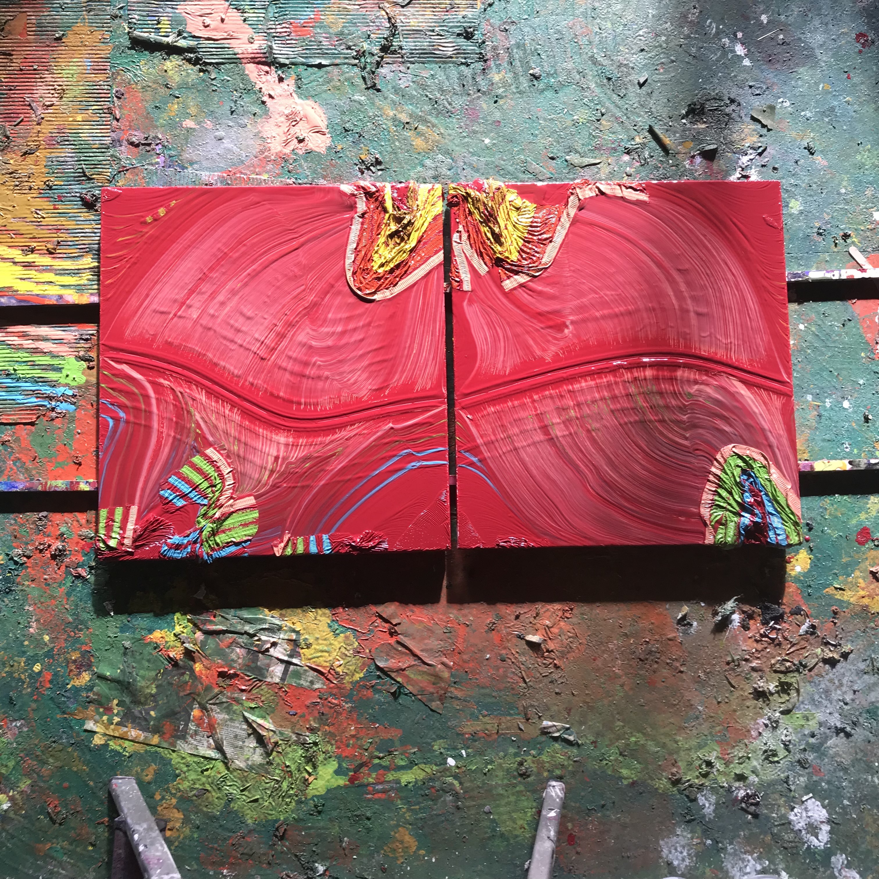 Una nuova intensità cromatica e un nuovo gesto pittorico sono presenti nei lavori recenti mostrati accanto ai precedenti dipinti a griglia e a strisce, più singolari, gravitazionali nella struttura e monocromatici.