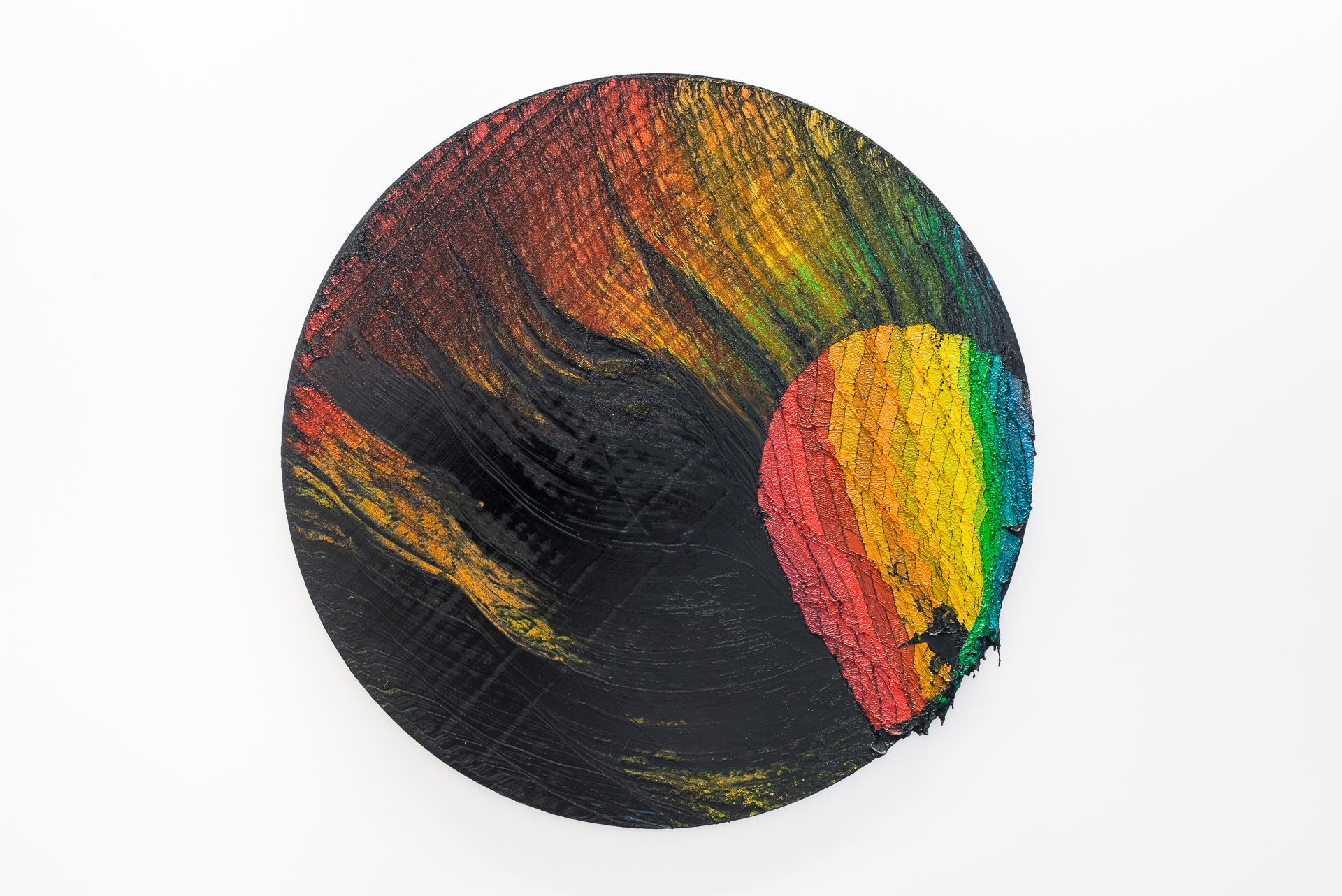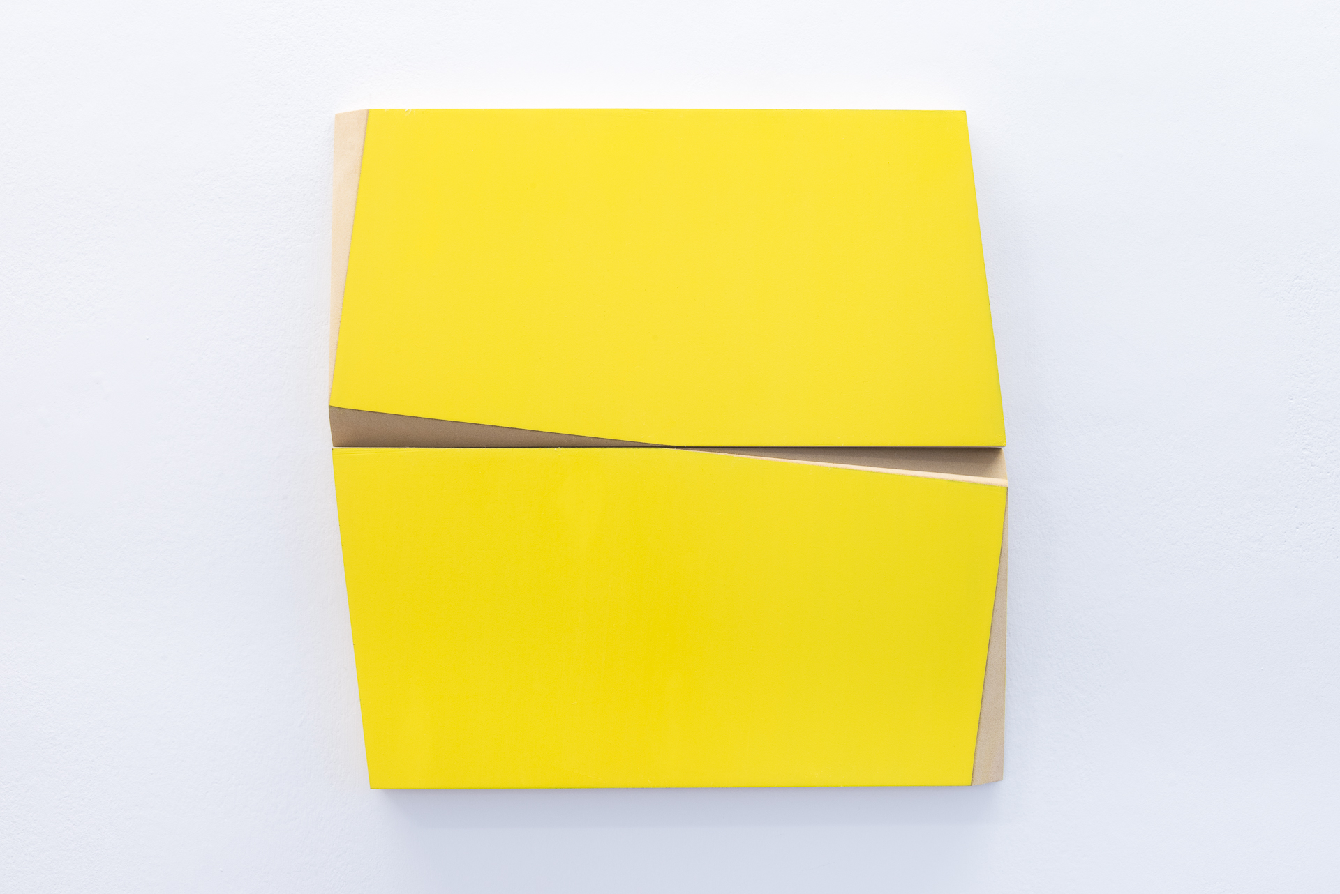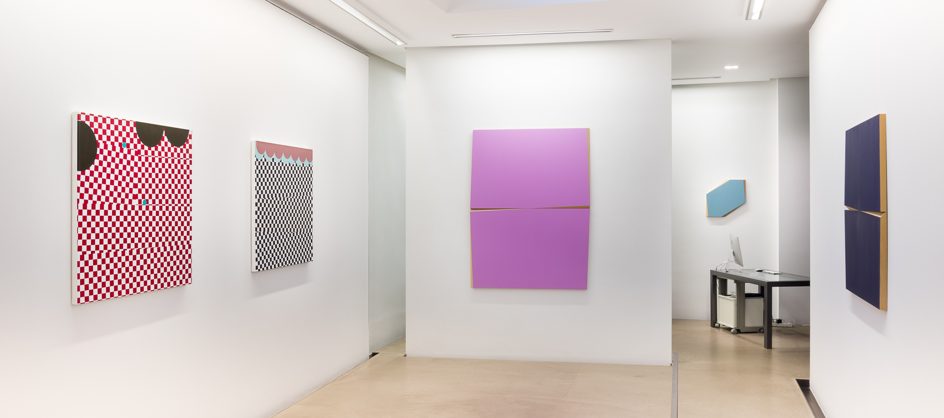 I dipinti su tavola in fibra di legno mostrano margini netti, sagomati di taglio che, oltre a funzionare da ingresso al dipinto stesso, lo allontanano dalla bidimensionalità della parete, proiettandoli in un gioco di rimandi geometrici con lo spazio. Si instaura così un dialogo tra dimensione pittorica e scultorea come pure tra costruzione programmata e naturalezza.