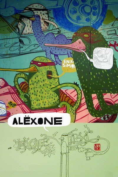 Il francese Alexone, trentenne, sviluppa un lettering originale negli anni novanta, scrivendo il nome Oedipe. Dal 1998 inizia ad usare materiali diversi rispetto allo spray, incollando, a Parigi e in molte altre città europee, centinaia di adesivi con i suoi eccentrici personaggi adottando lo pseudonimo Alexone. Da allora porta avanti entrambi i percorsi artistici (le lettere e i puppet) non escludendo – in futuro – di poter coniugare le due attività.