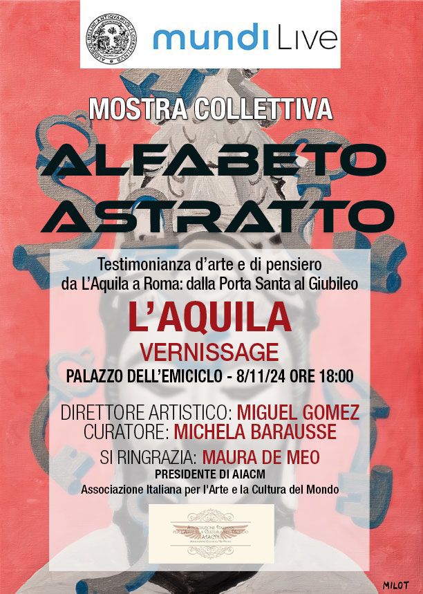 “Alfabeto Astratto” è il titolo della mostra che si terrà a L’Aquila presso il Palazzo dell'Emiciclo sede della Presidenza del Consiglio regione Abruzzo, dal’8 al 20 novembre 2024. L’esposizione è stata voluta dalla Dott.ssa Chiara Immordino Presidente della Fondazione Mundilive Placido Immordino che ha voluto al suo fianco il Direttore Artistico Miguel Gomez, gia art Director della Bibart Biennale d’Arte Contemporanea e Direttore del Museo dei pigmenti del colore e Centro d’arte Santa Teresa dei Maschi di Bari, la curatrice Michela Barausse e Maura de Meo Presidente AIACM (Associazione Italiana per l’Arte e la Cultura del Mondo).