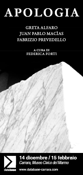 DATABASE 2013, progetto ideato e realizzato da Ars Gratia Artis in collaborazione con il Comune di Carrara invita l’arte contemporanea a rileggere il territorio di Carrara. Il suo programma continua (www.database-carrara.com) inaugurando, sabato 14 dicembre, presso il Museo Civico del Marmo di Carrara, la mostra collettiva Apologia a cura di Federica Forti, con cui termina DATABASE 2013.