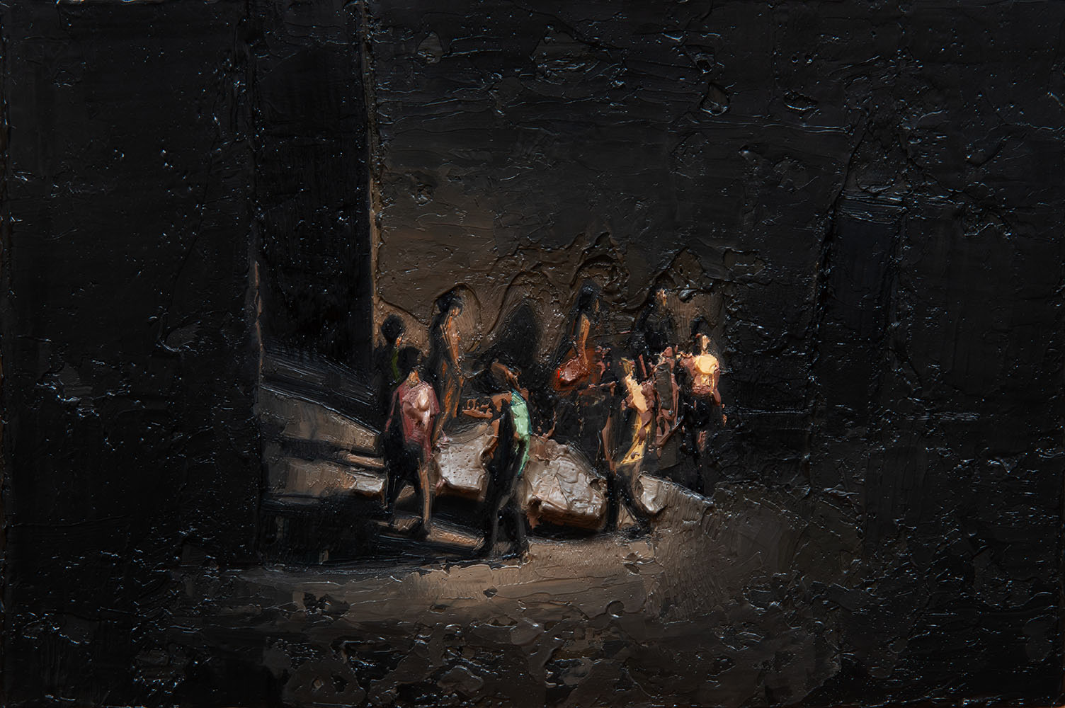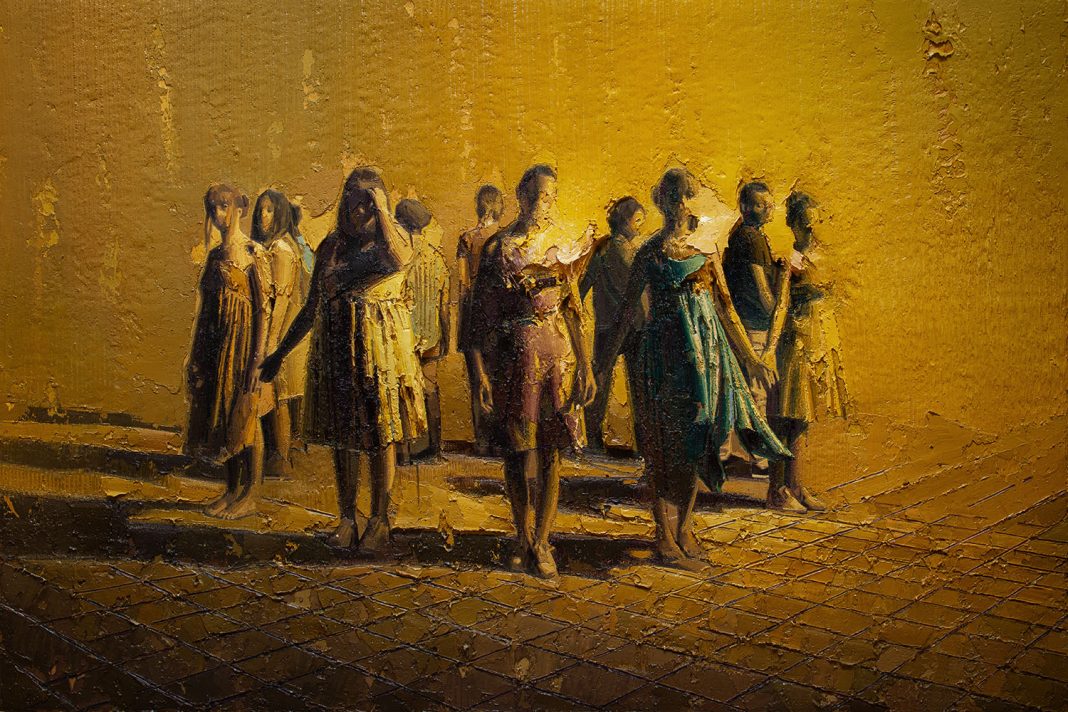 Il titolo dell’esposizione evoca vite che non trovano voce diretta, ma si svelano nei dettagli: nei muri scrostati, nelle pose delle figure, nel bagliore tragico, nelle cromie intense e nella densa trama materica. Strati che si sovrappongono e si lacerano, come il tempo che graffia, e rivela ciò che spesso rimane nascosto.