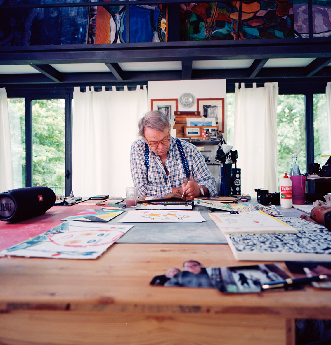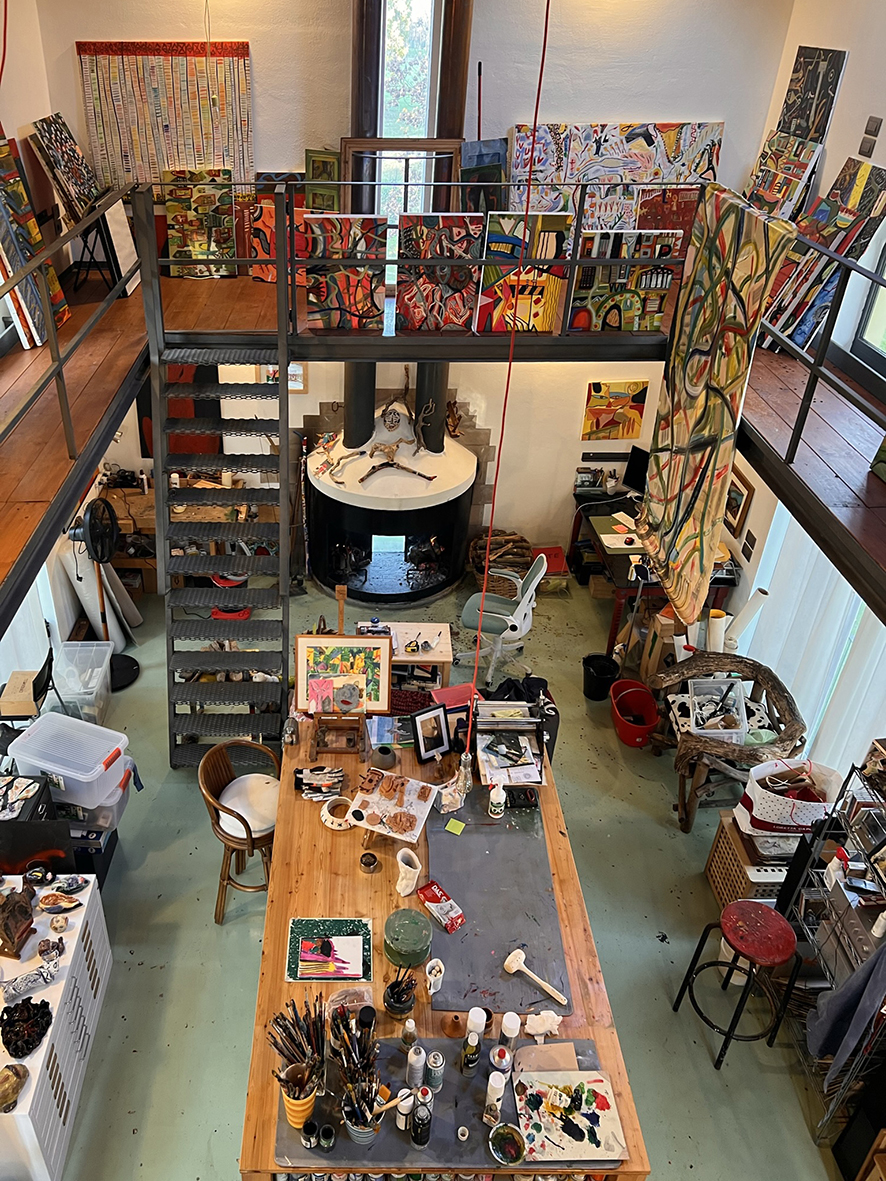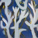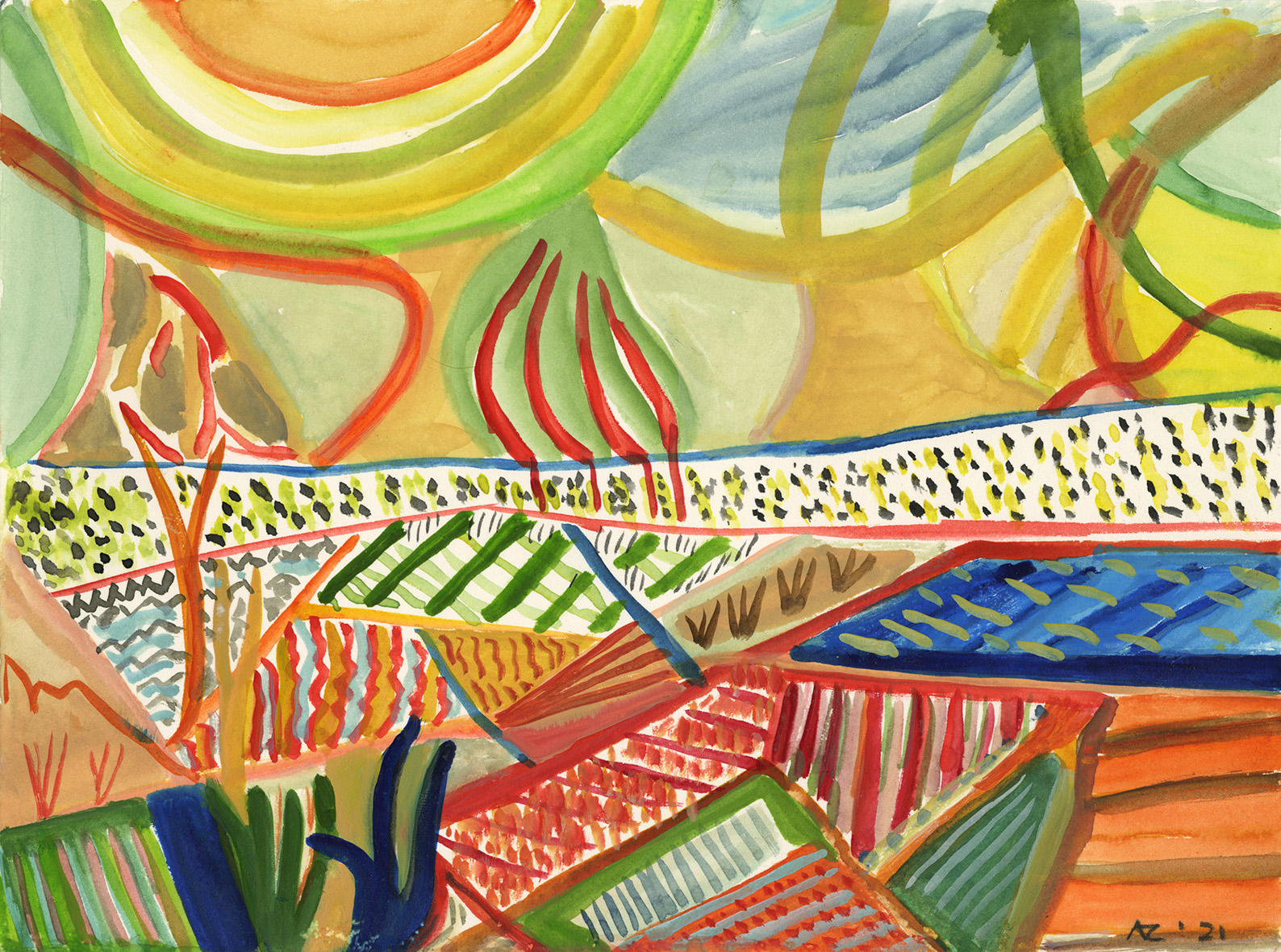 “lezione americana” è un’ampia esposizione che si sviluppa nelle Sale Putti e Capitolo, affacciate sul Chiostro di Sant’Agostino. Raccoglie una selezione di dipinti su tela, carta, legno, iPad Drawings, oltre a una ricca raccolta di acquerelli, in cui il colore riveste un ruolo fortemente espressivo, con campiture, tasselli e geometrie che trasmettono una intensa carica emozionale, realizzate con tecnica mista e l’utilizzo di una gestualità liberatoria e incisiva. A tratti, affiorano elementi naturalistici che richiamano luoghi, fisici e resi onirici dal tempo, come la casa di Stone Ridge, vicino a Woodstock a nord di New York, a cui si legano le memorie del passato.