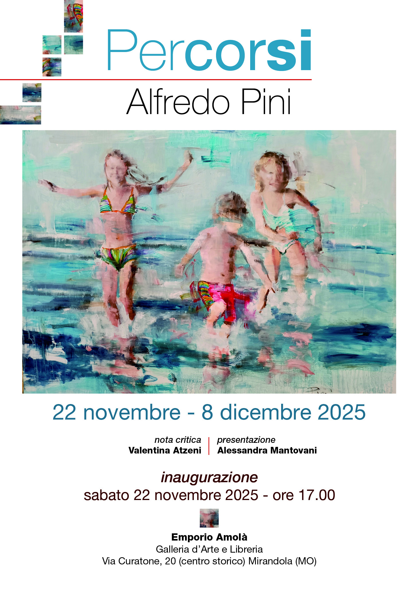 Sono più di trenta le opere, olii su tela e su carta, che Alfredo Pini espone presso la Galleria d’arte e libreria Emporio Amolà di Mirandola dal 22 novembre all’8 dicembre 2025. Si tratta di lavori per la maggior parte realizzati nel corso dell’ultimo anno, nei quali ai soggetti per cui è conosciuto, le vedute urbane fra tutti, l’artista affianca un nuovo ciclo pittorico in cui la figura umana, soprattutto donne e bambini, è protagonista. La mostra, dal titolo Percorsi, vuole sottolineare alcuni aspetti della ricerca pittorica del maestro, nella quale il percorso che porta dalle immagini delle città alle nuove raffigurazioni del ciclo Adriatico e dei nudi è soprattutto mentale e mira a coinvolgerci in sensazioni contrastanti passando dalla frenesia al desiderio di tranquillità, dal disorientamento al bisogno di certezze, dall’ansia alla ricerca di serenità, in quel contrasto di stati d’animo quasi dicotomico, tipico dei nostri tempi... (Valentina Atzeni)