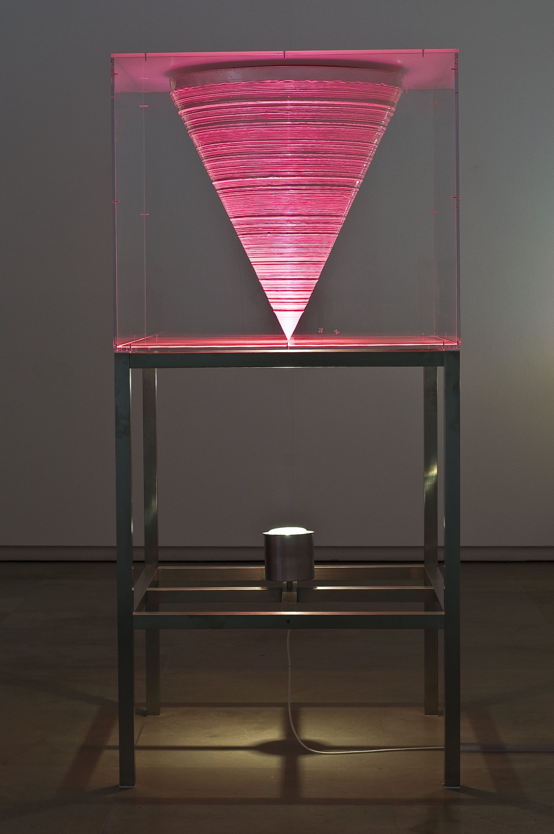 Se la superficie viene assiduamente trattata da Pirri come elemento prettamente spaziale, i lavori tridimensionali hanno sempre una forte matrice pittorica, anche quando, come accade in Canto n.1. Progetto per un film - l’installazione esposta al piano inferiore della galleria - l’elemento di partenza è una pellicola cinematografica. Una teca trasparente racchiude il calco conico della pellicola originaria, con il vertice rivolto verso il basso. Illuminata da sotto, la sua forma si irradia e si sdoppia, divenendo “l’immagine di una proiezione luminosa nello spazio e anche di un’espansione all’infinito della sua matrice originale”.