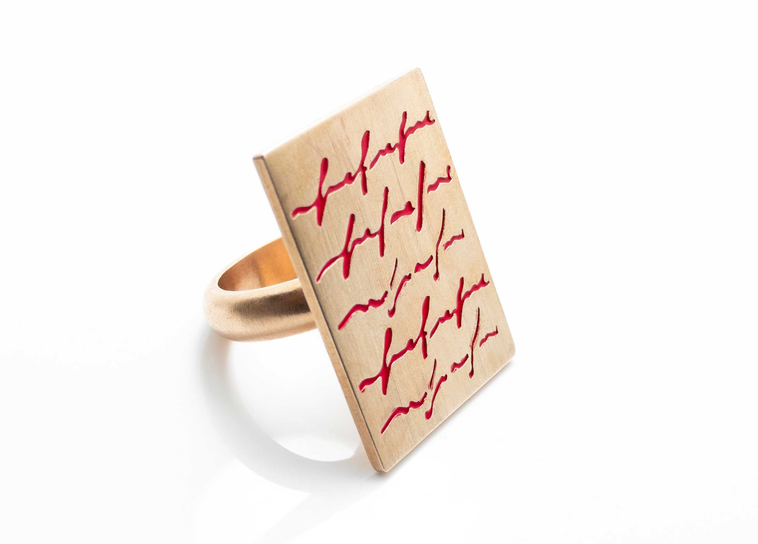 "Senza scrittura non saremmo niente non avremmo coscienza di noi stessi", dice Alfredo Rapetti. E non a caso la parola è la radice comune delle sue due professioni, di autore di canzoni e di pittore. Utilizzando nelle sue tele la tecnica della puntasecca, Rapetti restituisce valore all’atto dello scrivere a mano. I suoi “geroglifici”, segni destrutturati che campeggiano al centro delle opere monocrome in un ordine non immediatamente leggibile, sono quasi incisioni sulla pellicola pittorica e creano un alfabeto personalissimo ma allo stesso tempo universale, dove la parola è apparentemente svuotata di ogni senso e della sua funzione originaria, ma in cui acquisisce in realtà una valenza universale. Se viene dato loro il giusto peso, le parole sanno ricostruire significati nascosti, dettati dalla capacità di immedesimazione del fruitore nel momento in cui legge l’opera. Come nella pittura, così nel gioiello l’artista riparte dal significante per dare vita ad un alfabeto inusitato e personale, servendosi di effetti grafici diversi (lucido/opaco, piatto/sporgente) e delle combinazioni rese possibili dalle coppie (orecchini, gemelli,..) per ricreare anche nella tridimensione un linguaggio plasmato ex novo: oltre ai giochi linguistici, anche la presenza fisica della persona crea ulteriore spaesamento fra significato/significante. Basta così indossare ai due lobi le lettere I e O per riscoprire improvvisamente la centralità del proprio essere; o ancora, ruotando il polso, si riesce ad identificare la parola “anima” in mezzo ad un insieme apparentemente casuale di lettere. Liberato dalla gravità della sua primitiva funzione, il segno grafico diventa anche nel gioiello un veicolo emozionale per chi ha la sensibilità di leggervi il potere nascosto.