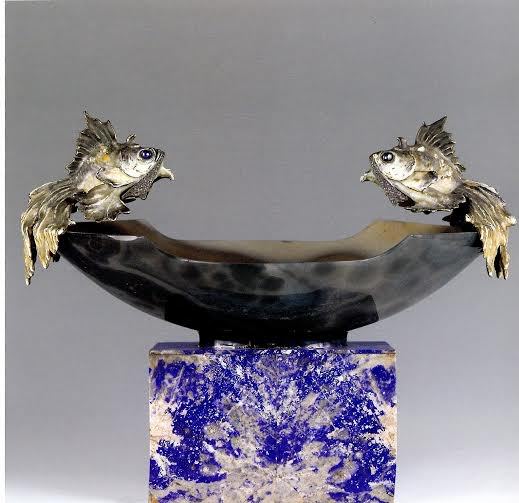 Fu infatti nella realizzazione di coppe, scatole, bomboniere, soprammobili e sontuosi centrotavola, tutti ornati con gemme preziose, coralli e perle, che l’opera di Ravasco raggiunse livelli di estrema raffinatezza e originalità. Sin dai primi esemplari il gusto per la geometria colorata del gioiello Déco è abbinato da Alfredo Ravasco al particolarissimo uso di pietre dure dalle tinte variegate e vivaci – malachite, onice, agata venata – impiegate in composizioni dove a elementi solidamente geometrici si uniscono dettagli veristici in oro smaltato: pesci, pavoni, serpenti, orsetti.