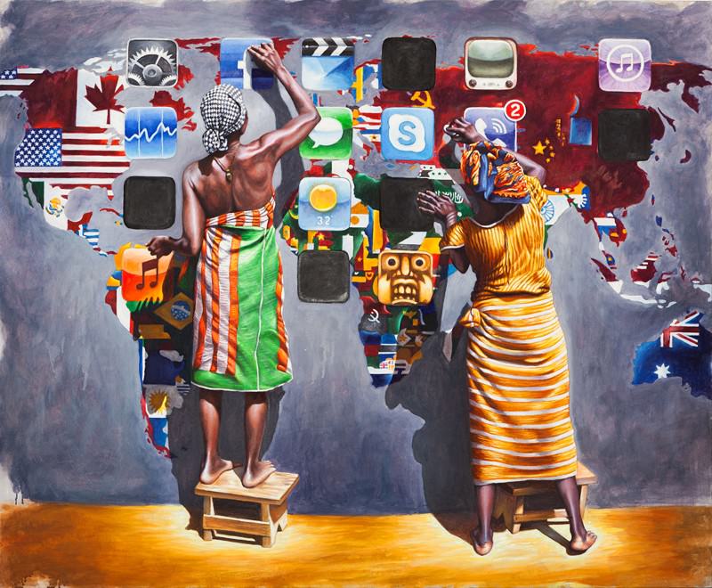 Il tema più evidente fra quelli che emergono nella sua ricerca pittorica è un’idea di “umanità” come qualità universale e comune fra tutti i popoli, fondata su una spiritualità originaria che precede le diversificazioni religiose e politiche. Così l’artista si fa interprete di culture diverse ma confrontabili, che convivono nello spazio perfettamente orchestrato delle sue tele coloratissime. I personaggi della recente “rivoluzione dei gelsomini” o di un’Africa tanto vissuta, quanto favolosa e immaginata, nelle sue composizioni sono tutti catturati in un gioco di citazioni colte e di rimandi indiretti tra figura e sfondo.