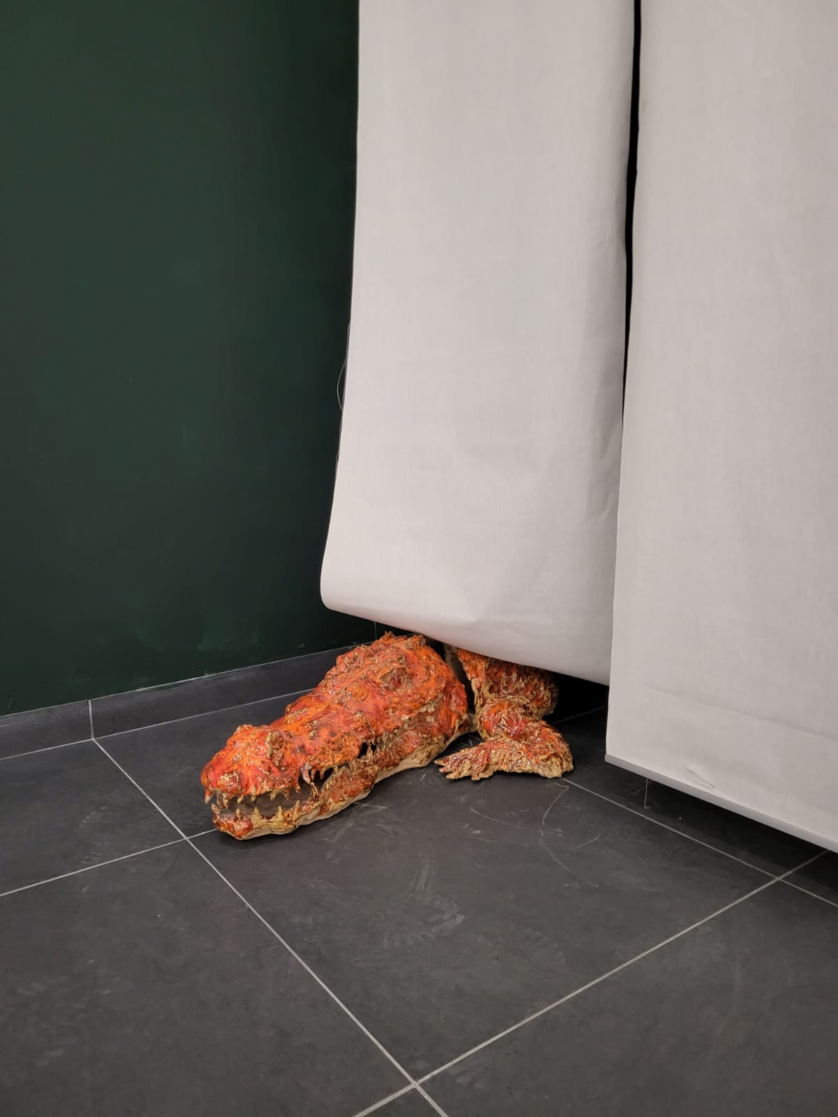 Alla suggestione per la cultura antica si aggiunge anche quella per il mondo animale, universo in cui la mitologia, in quanto racconto che tramanda misteri e leggende, ha un ruolo fondamentale. Il grande coccodrillo rosso evidenzia, nella sua frammentarietà, il rimando ad architetture naturali arboree o a resti archeologici come se fosse avvenuta una metamorfosi interna, intima, un ineluttabile ritorno mistico all'unità del tutto.