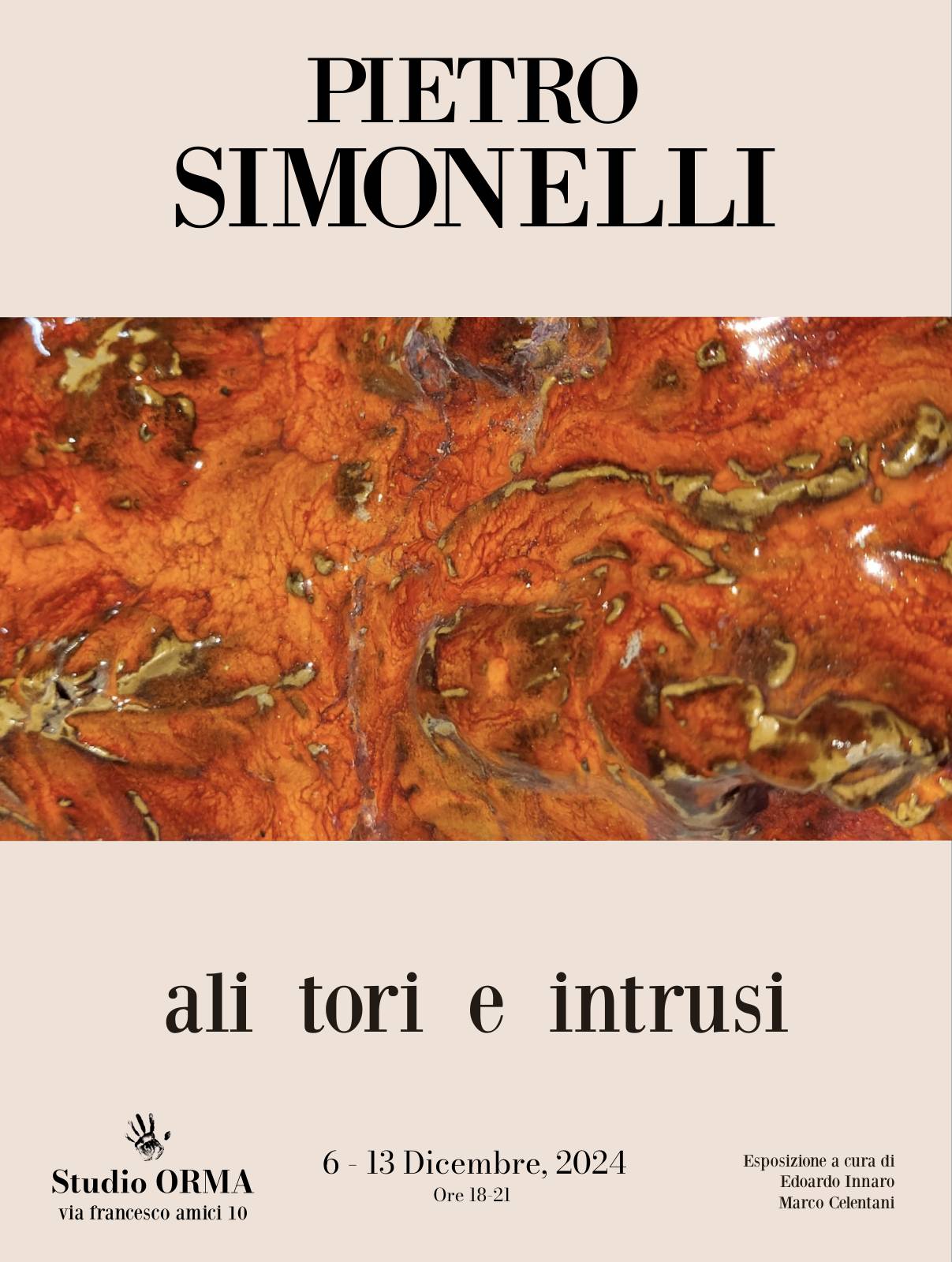 Venerdì 6 dicembre 2024 alle ore 18, lo Studio ORMA, inaugura la mostra Ali tori e intrusi di Pietro Simonelli. L’esposizione, curata da Marco Celentani ed Edoardo Innaro, presenta numerose sculture in ceramica smaltata insieme ad alcuni dipinti e pastelli realizzati dall’artista fra il 2022 e il 2024.