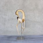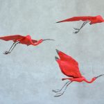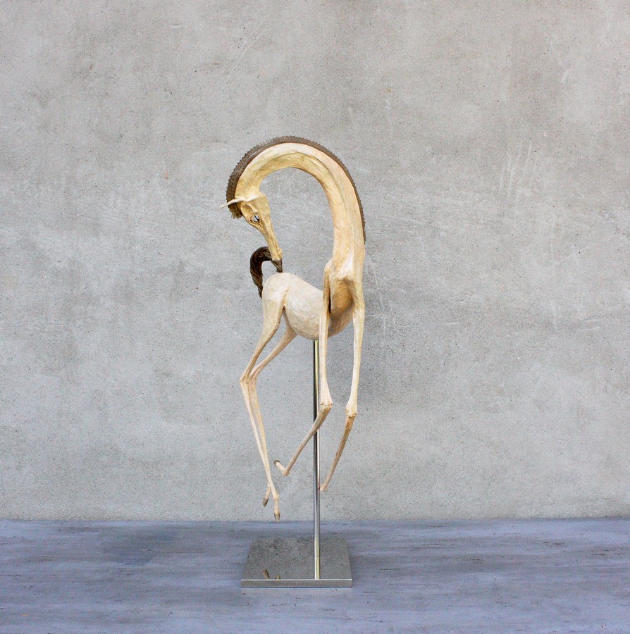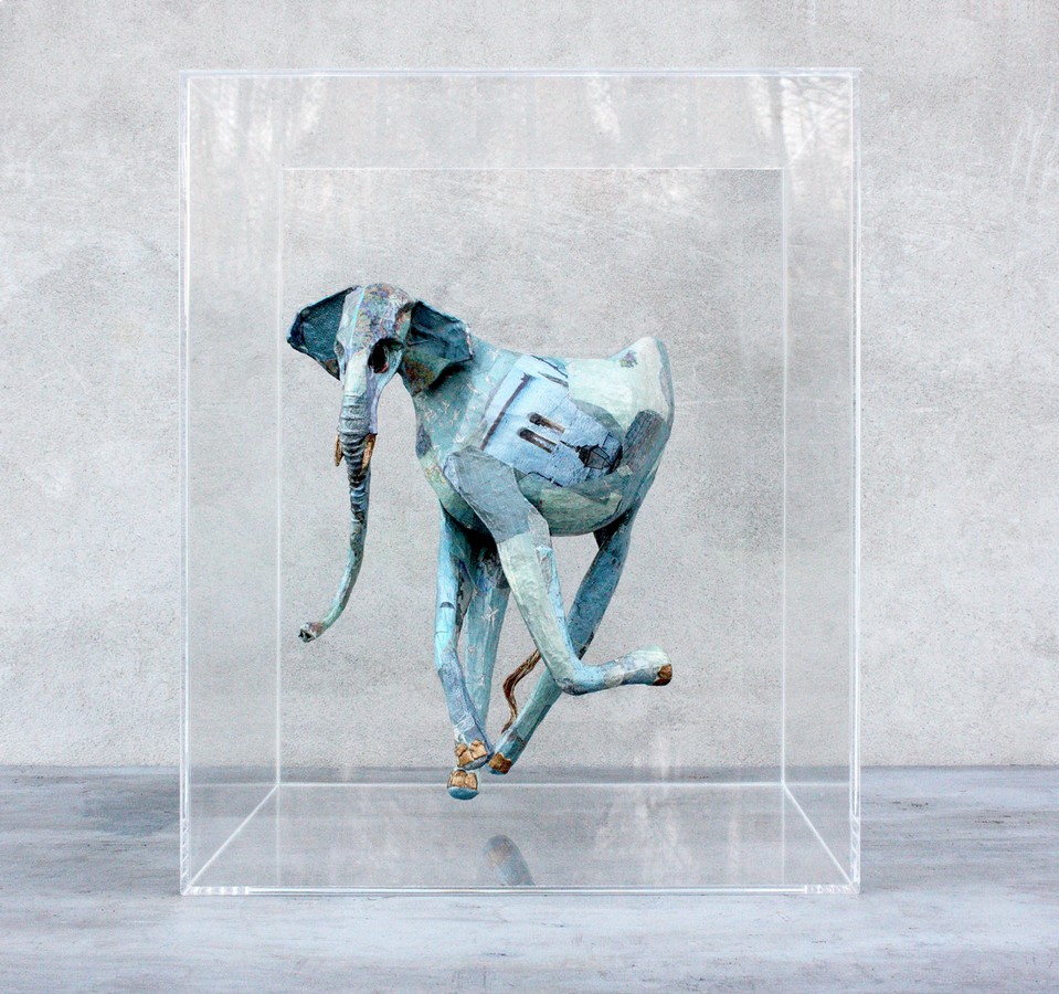 La ricerca dell’artista gioca sulla percezione confondendo i sensi dello spettatore, mettendo in scena una coreografia di bizzarri animali sgravati dal loro peso corporeo, figure eleganti che fluttuano leggere come l’aria e delicate come la carta. Sospese da fili trasparenti e chiuse in teche di plexiglass, queste creature, maestose e aggraziate, in bilico tra illusione e realtà, appaiono come incantate per farsi osservare in tutta la loro bellezza, donandoci il tempo per riflettere sul nostro rapporto con gli altri esseri viventi.